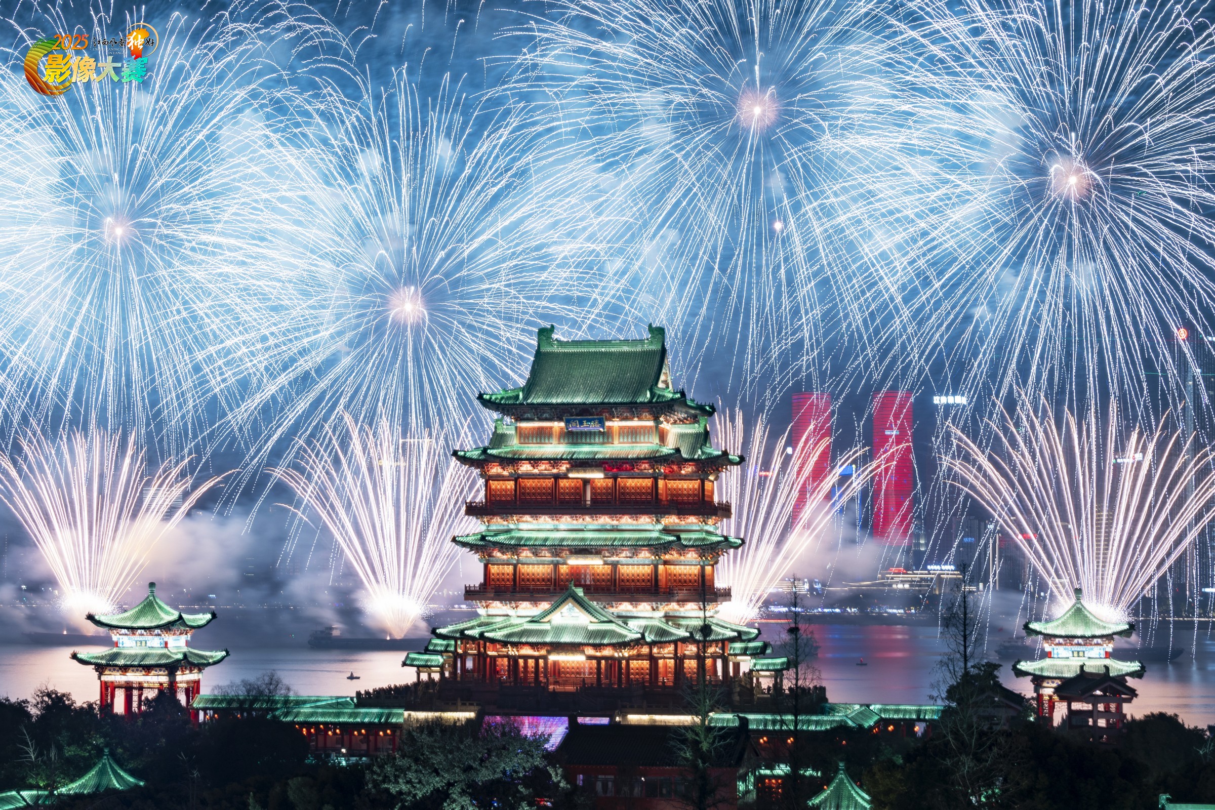 烟火织就银树,漫过滕王阁的翘角飞檐,朱栏丹柱裹着流光,千年檐角接住漫天星火,赣江风里漾着今时的热闹,把“落霞孤鹜”的诗意,酿成此刻火树银花的滚烫。这一瞬,古阁与烟火对语,晕开一城的盛景与欢喜。