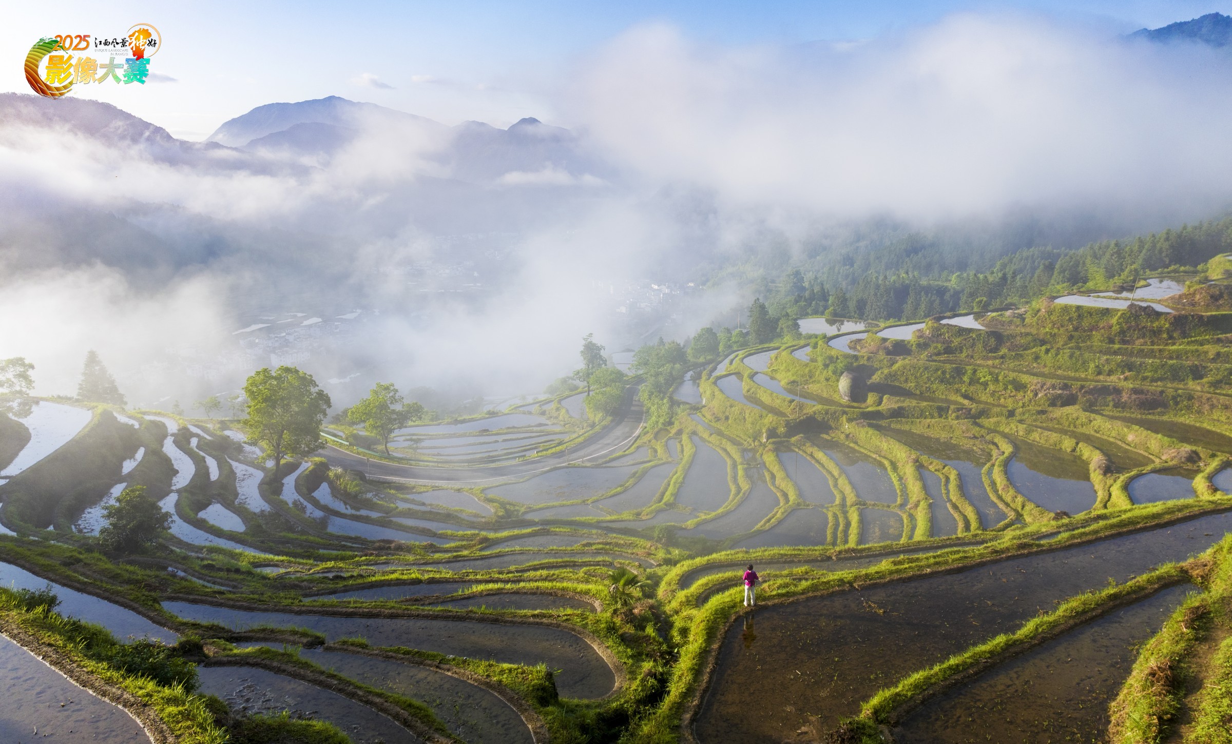 江岭的梯田缠在雾里,水色裹着新绿,连风都染了山野的软。红影踩在田埂上,把云岚与春声都揉进层叠的曲线里——这是大地织的锦,每道褶皱都藏着婺源的诗意。