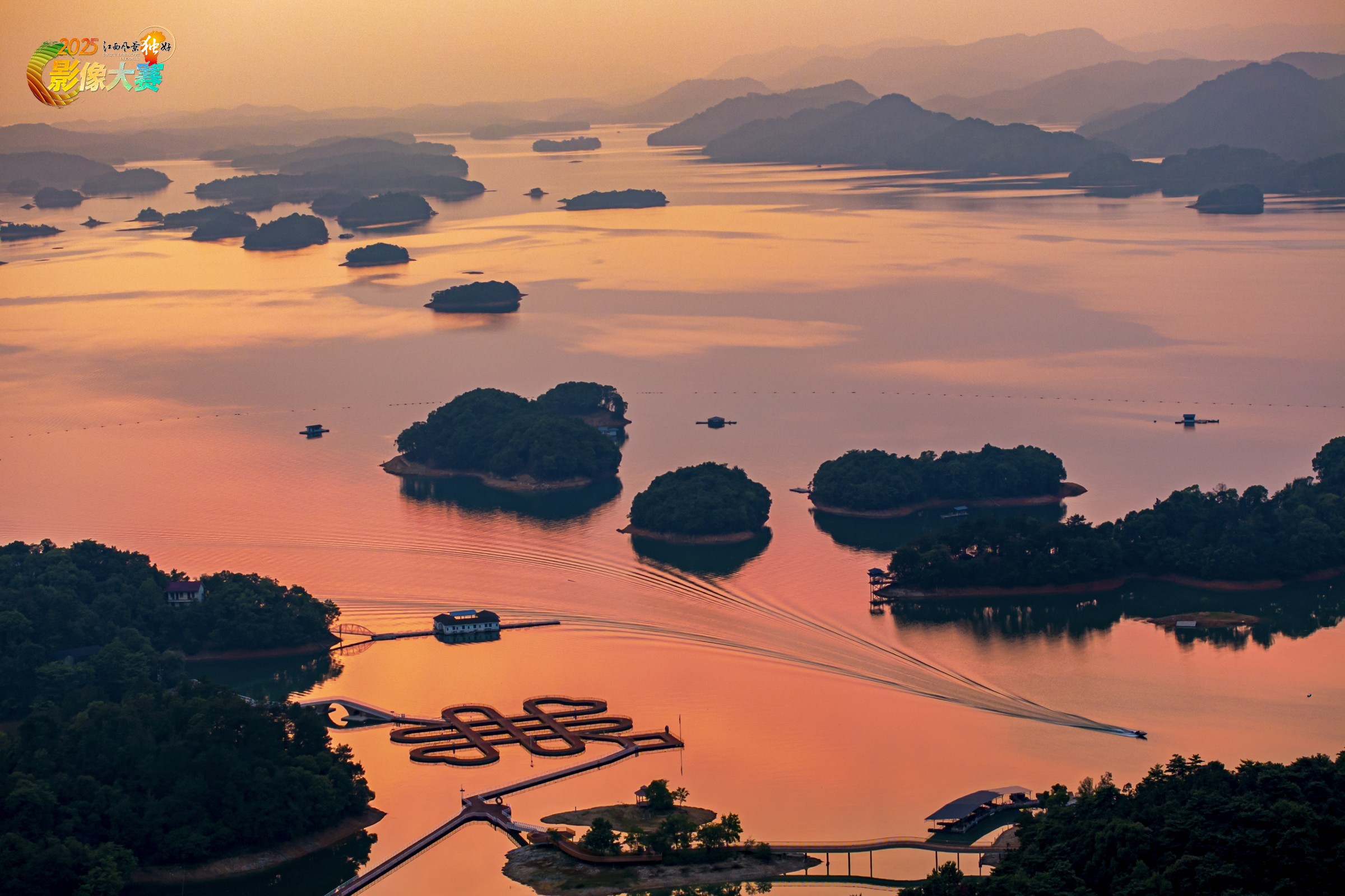 庐山西海的黄昏把水色染透,粉紫霞衣裹着星罗的岛,船迹牵出软风里的波纹。连岛的栈桥织着细碎的光,这方天地的温柔,是西海把暮色酿成的诗,每缕晕染都裹着湖山的闲静。