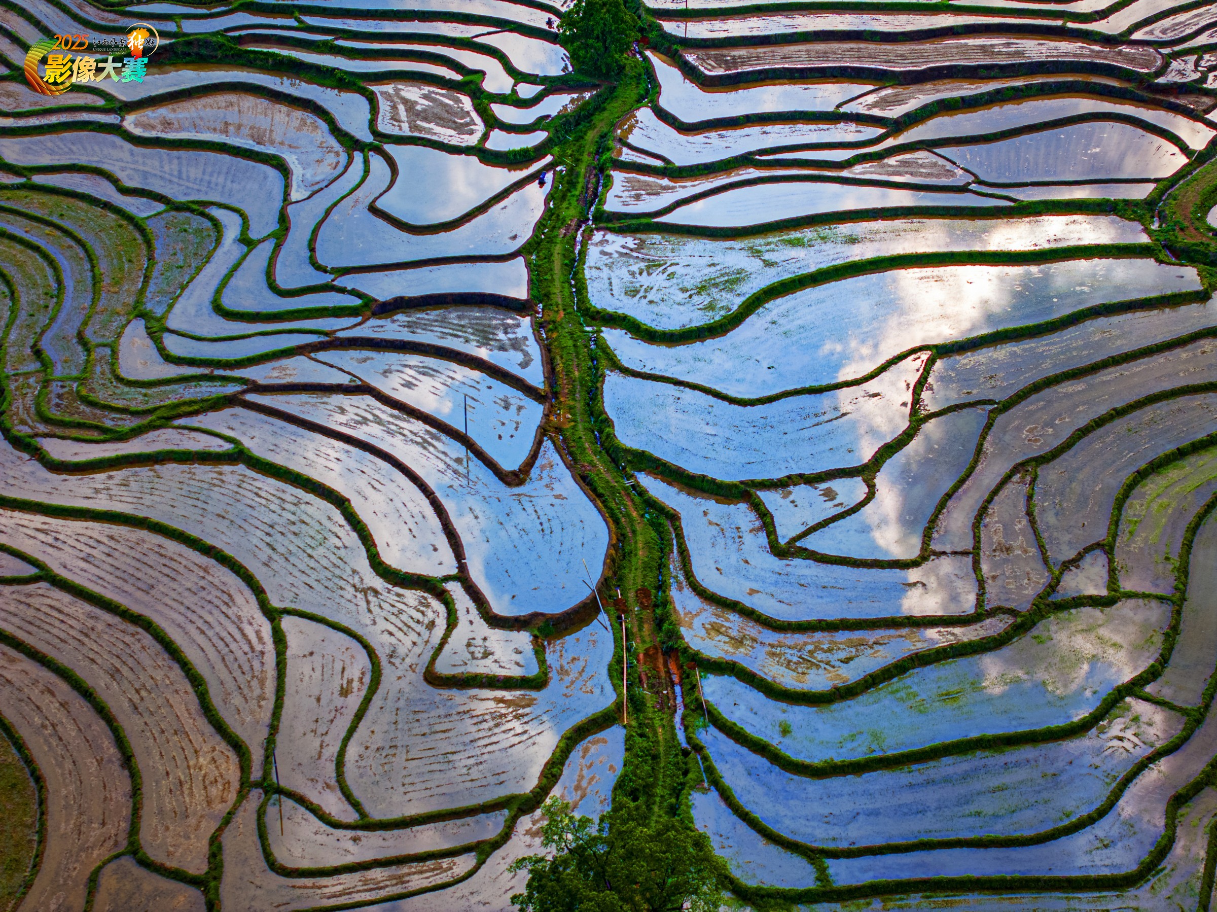 潭山梯田如碎镜铺展,水色裹着天光,蜿蜒的田埂似绿带牵起层叠的蓝。天地的清透落进每道褶皱里,这是大地织的锦,把云影与春声都揉成了诗意的纹路。