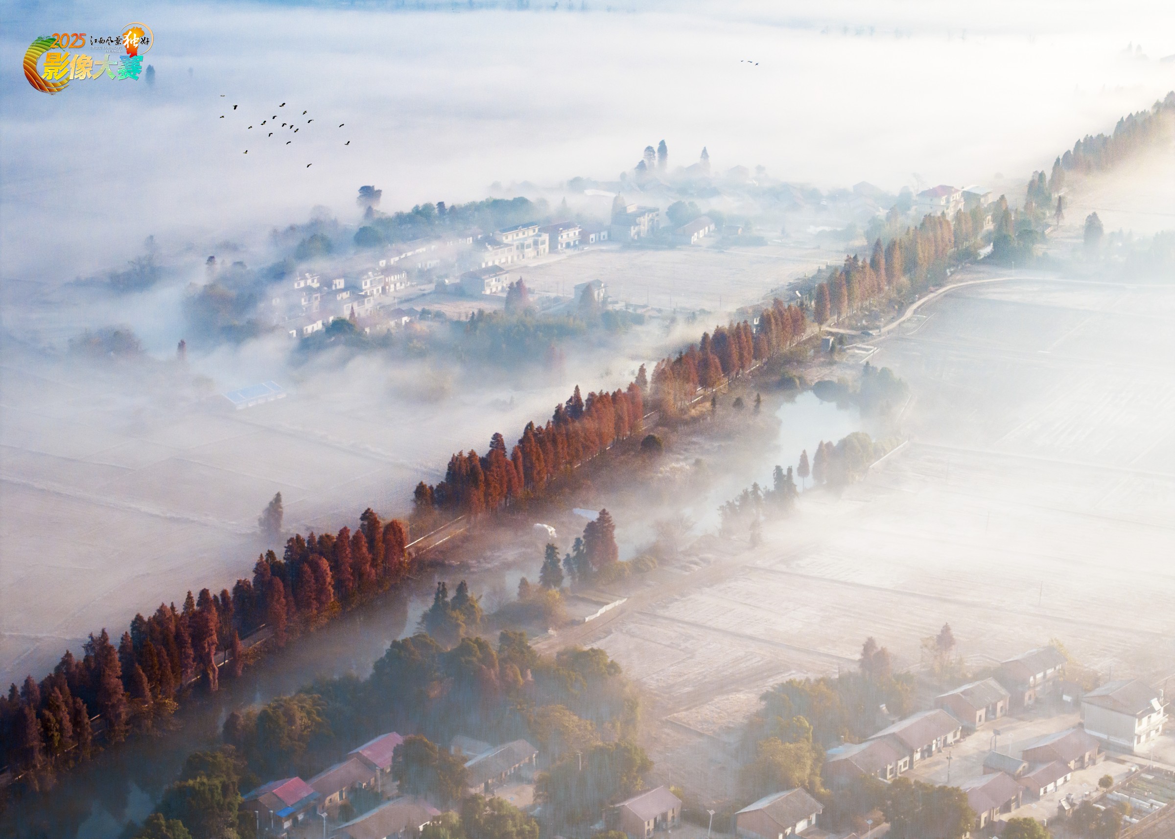 鄱阳湖边的小村,雾纱裹着乡野,红杉如焰烧透晨霭,连风都染了暖调。村舍隐在烟岚里,候鸟牵走薄雾的软——这是秋日藏的温柔,每缕光影都织着烟火与诗意。