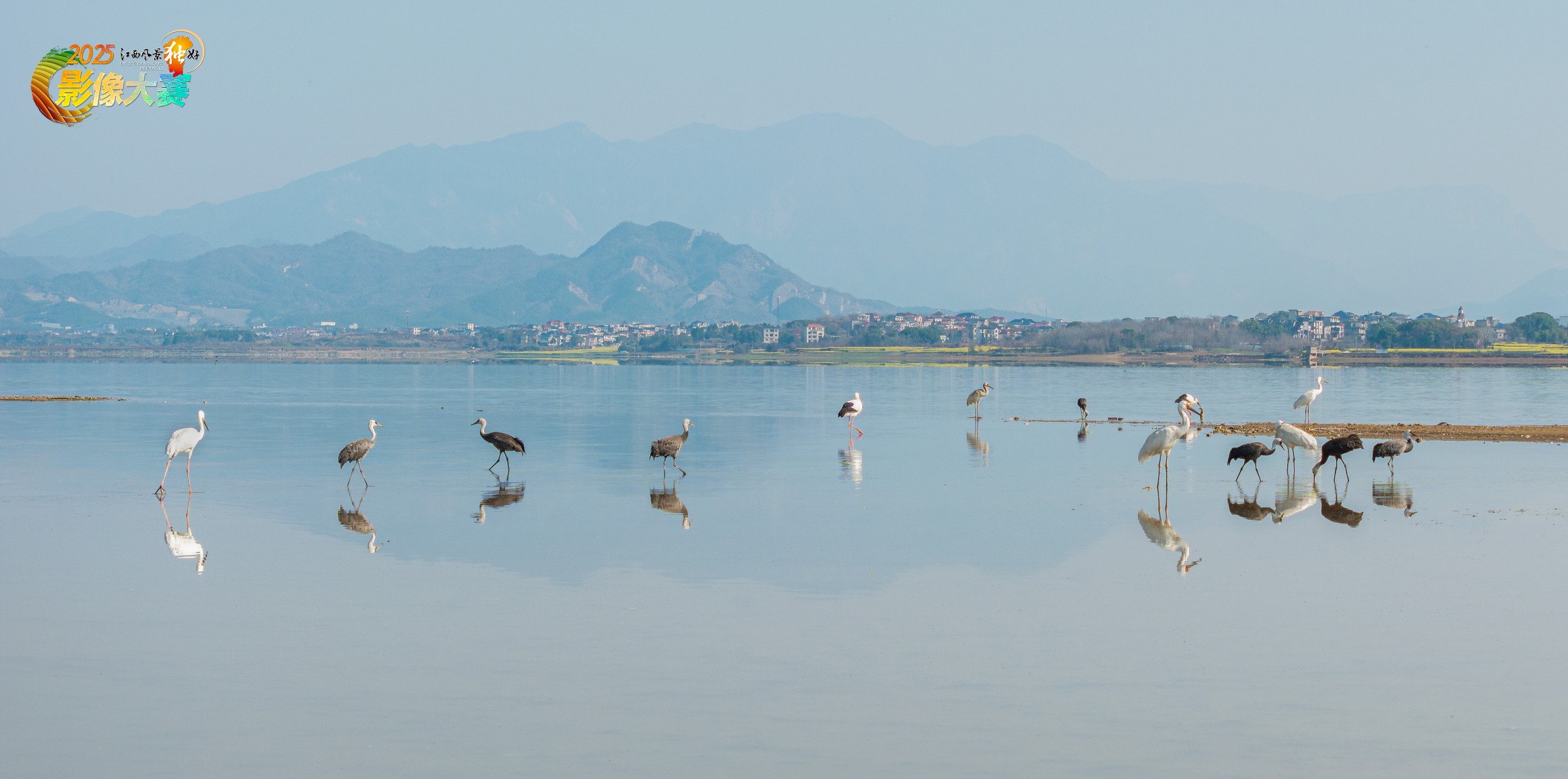 在江西庐山南麓的寺下湖,白鹤,白头鹤,白鹳等候鸟为北迁补充能量,构成了春天美丽的画卷。