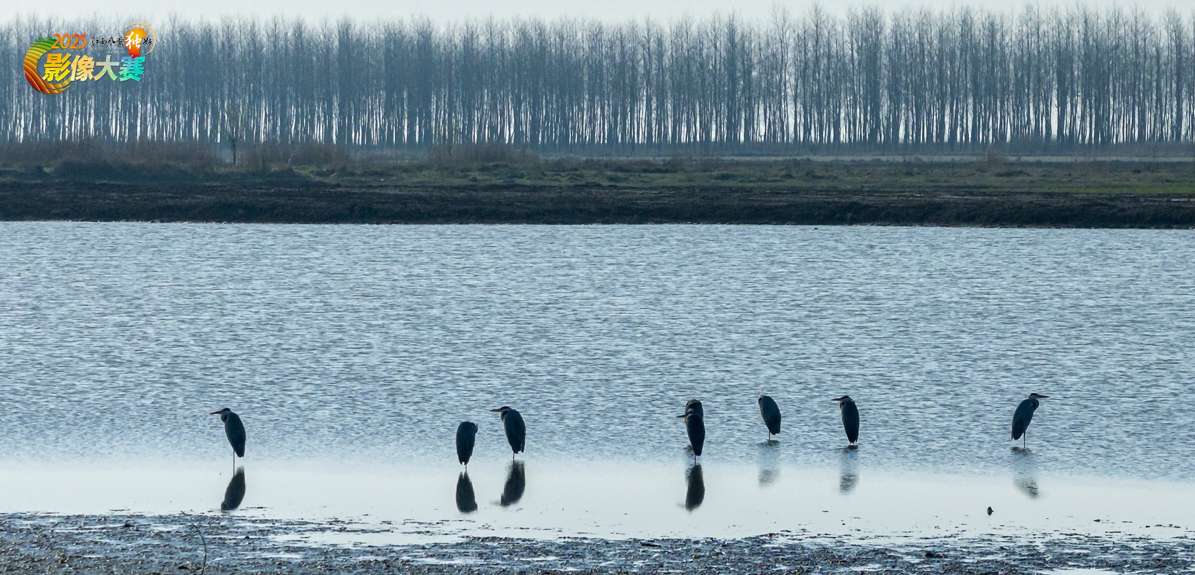 湖畔,几只苍鹭静立湖中,乐享自然之美。