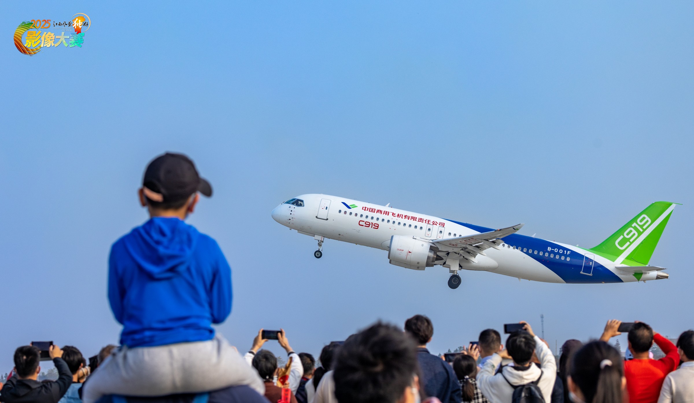 孩和飞机的大小对比,像把梦想具象化。色彩是飞机的白蓝绿、人群的斑斓,在纯蓝天幕下特别精神。光影亮堂,给飞机镶了层锐气,每双举着手机的手都透着 “追国之重器” 的热乎劲。