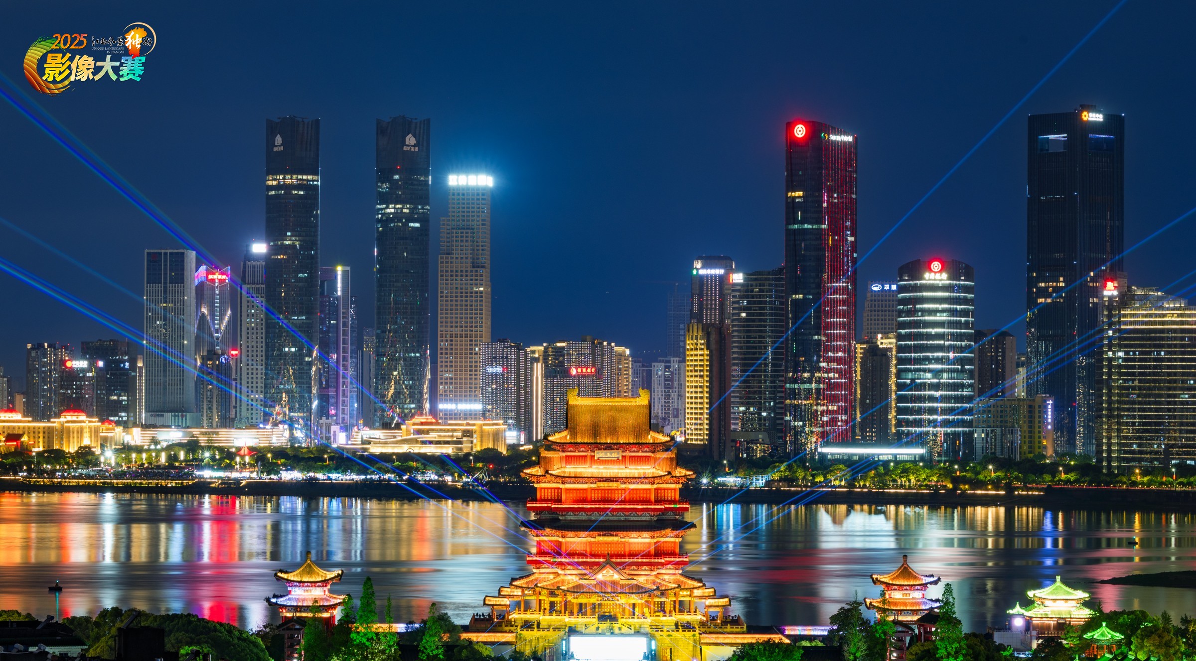 滕王阁、现代楼群、江面焊成时空裂缝,激光线像给古今牵了根电索。色彩是古建的金红、摩天楼的霓虹、江水的彩光,像把唐宋与赛博的颜料全泼进去。光影毒,夜色给建筑镶钻,每道激光都在喊 “这是南昌的魂”。