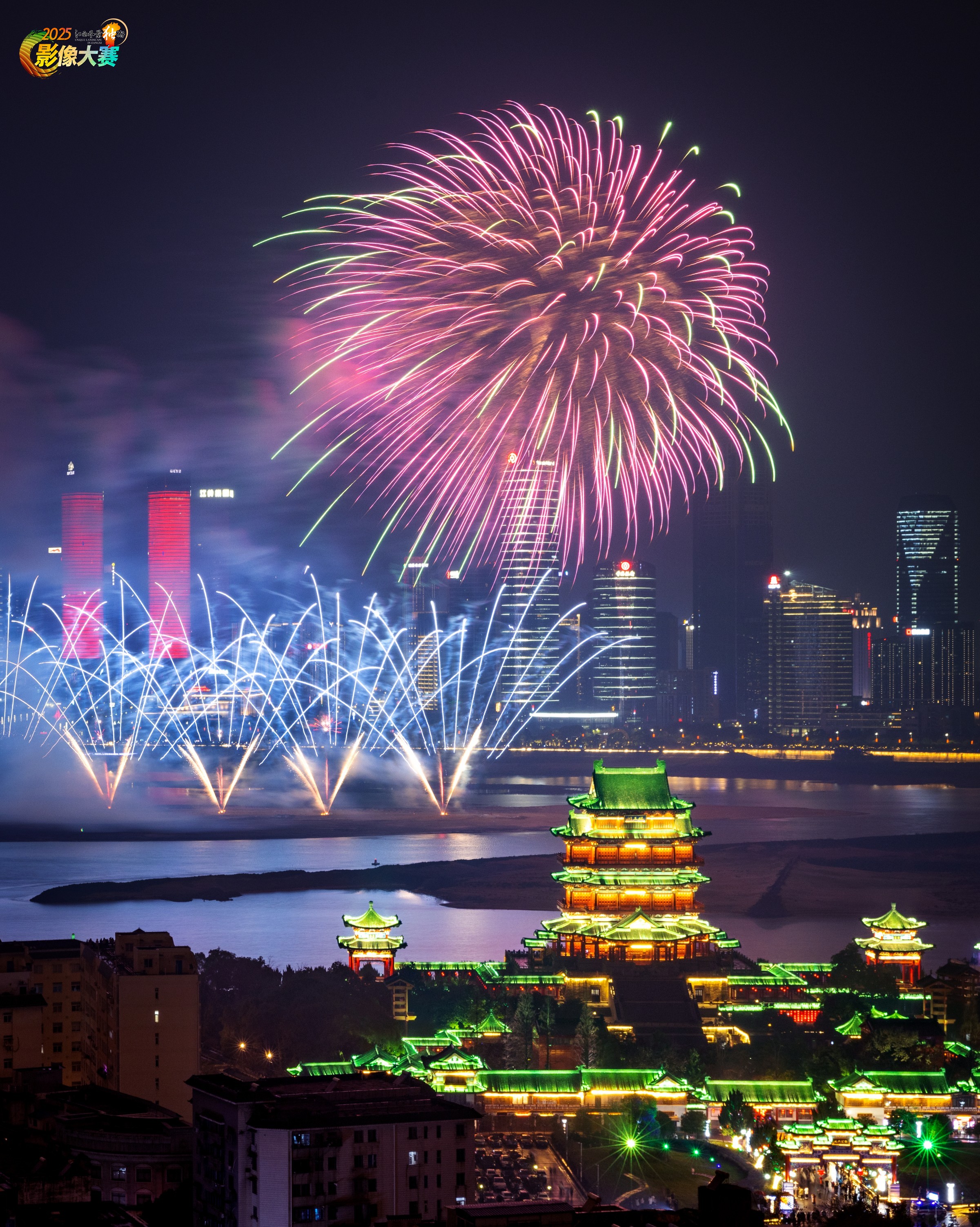 古建、烟花、现代楼群焊成视觉炸弹,滕王阁像被烟花捧成 C 位巨星。色彩是烟花的粉紫、古建的金绿、江水的幽蓝,像把盛唐与赛博的颜料炸上天。