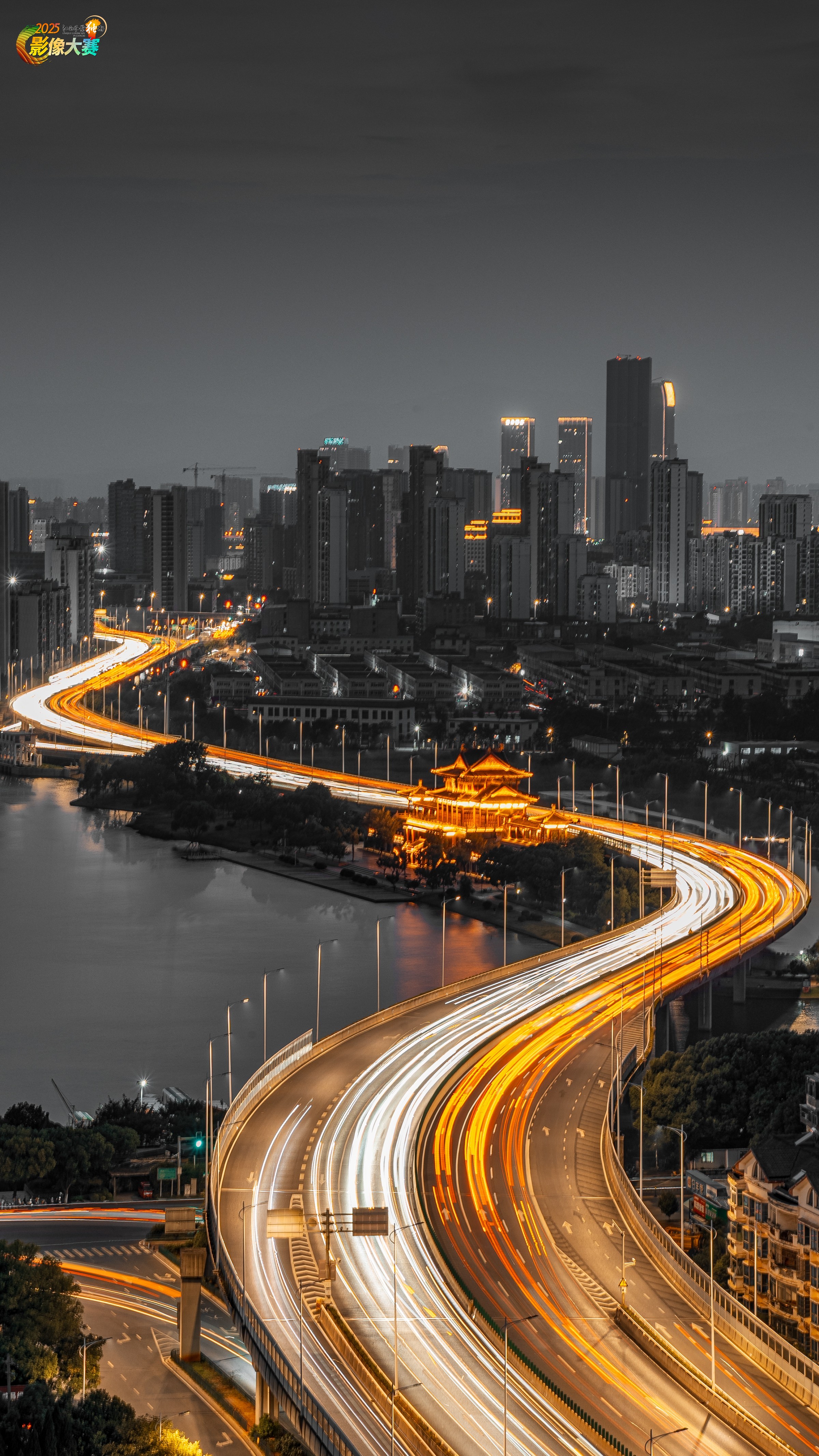 通过公路线条引导视线,将传统地标与现代高楼融入同一画面,展现城市昼夜交替的流动感与时空张力。