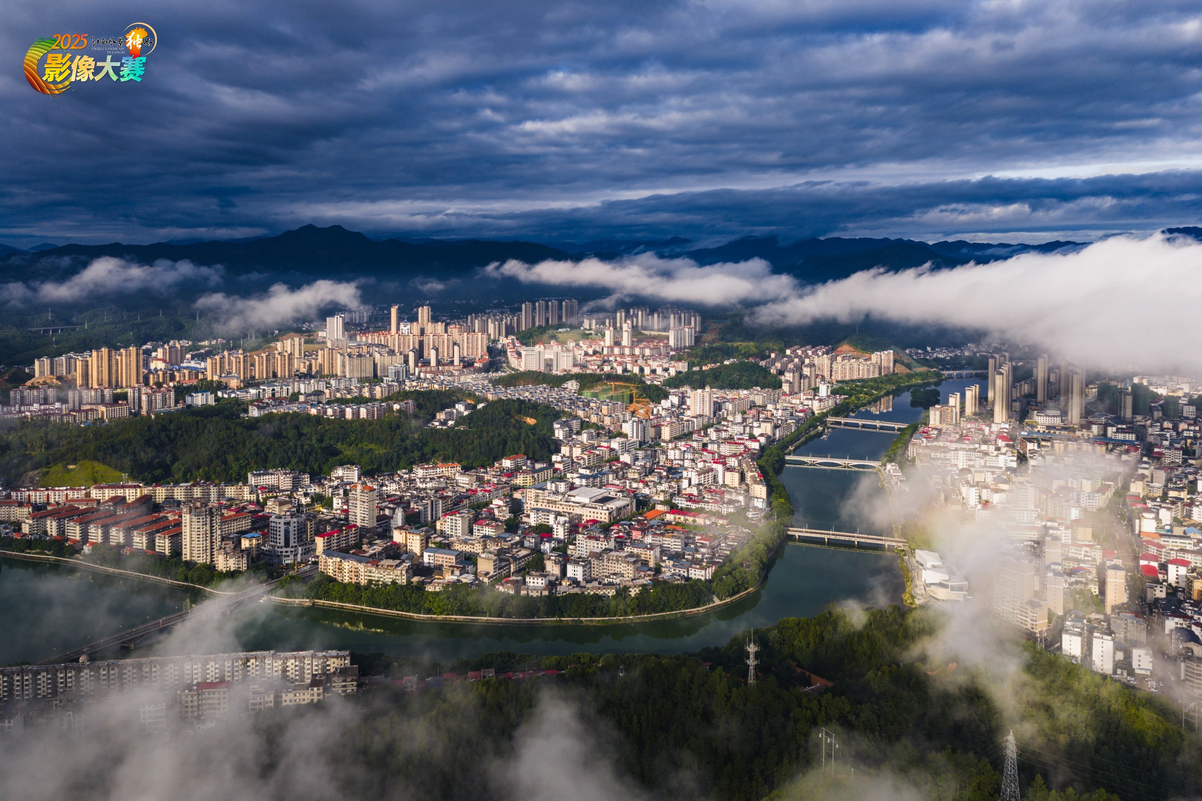 《山水之城》作品是作者2025年7月1日拍摄于江西省赣州市上犹县。云雾轻裹山城,江水如带环伺楼宇,桥影牵起两岸烟火,新旧屋舍错落在林麓间。云浪漫过天际,将都市的烟火晕染得温柔朦胧,恰似一幅栖于青山秀水间的宜居长卷。