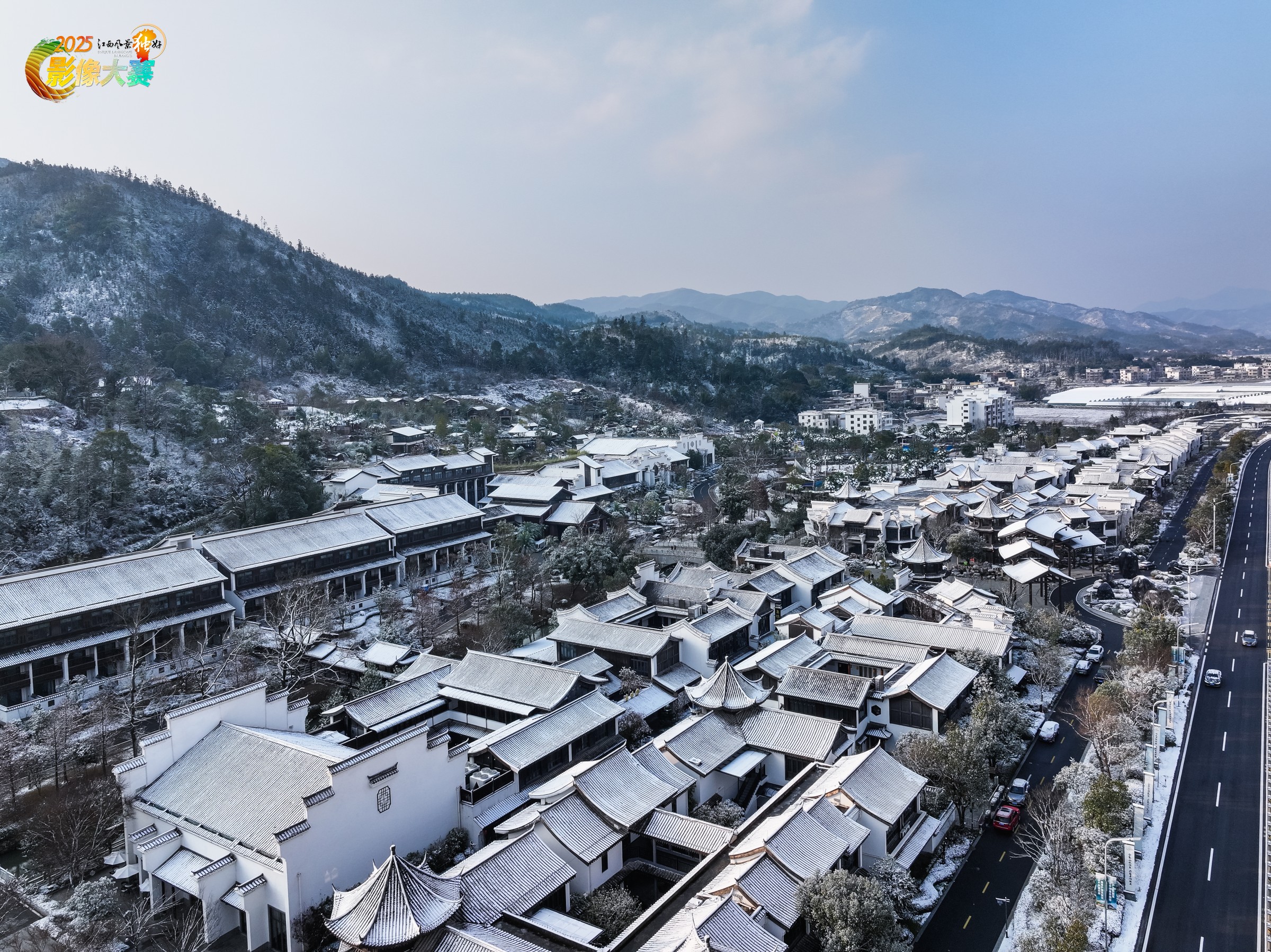 《雪沐小镇》是作者2024年1月24日拍摄于江西省赣州市上犹县。雪裹黛瓦,白覆青山,徽韵建筑错落成银装里的诗行。路畔车影轻掠,远山层叠含霜,这方天地把冬的清寂与烟火的温软,织成一帧素净的雪后栖居图。