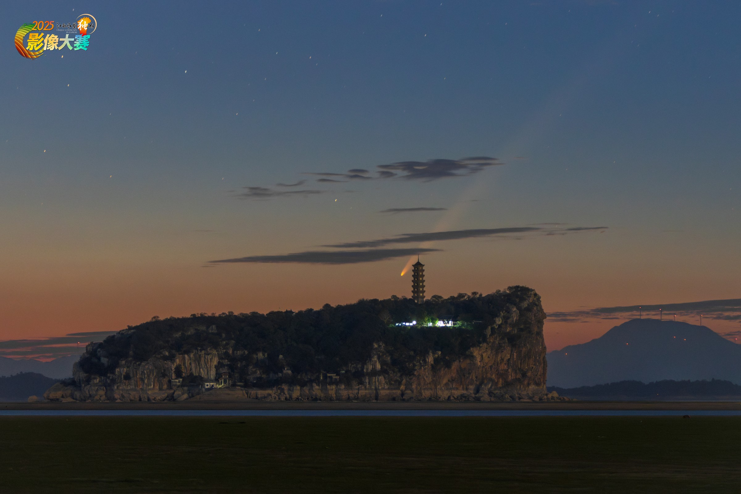 2024年10月,6万年一遇的紫金山-阿特拉斯彗星C/2023 A3(Tsuchinshan - ATLAS)从鄱阳湖上升起,长长的彗尾从鞋山大孤塔上方射向天空。