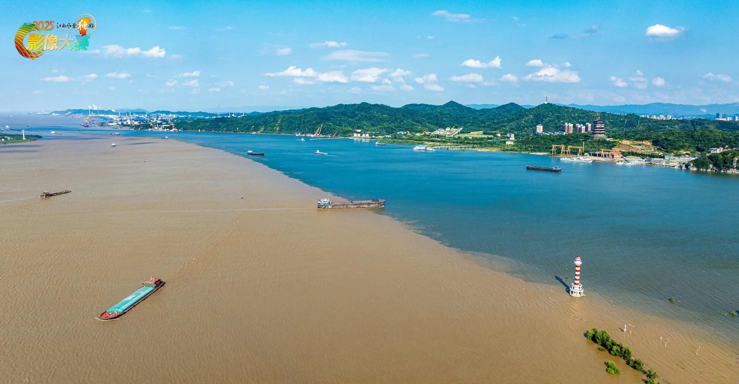 长江与鄱阳湖交汇呈现 “江湖两色” 的景观。