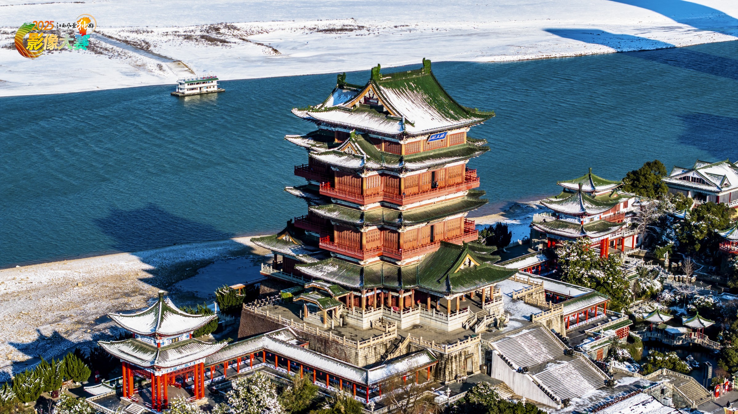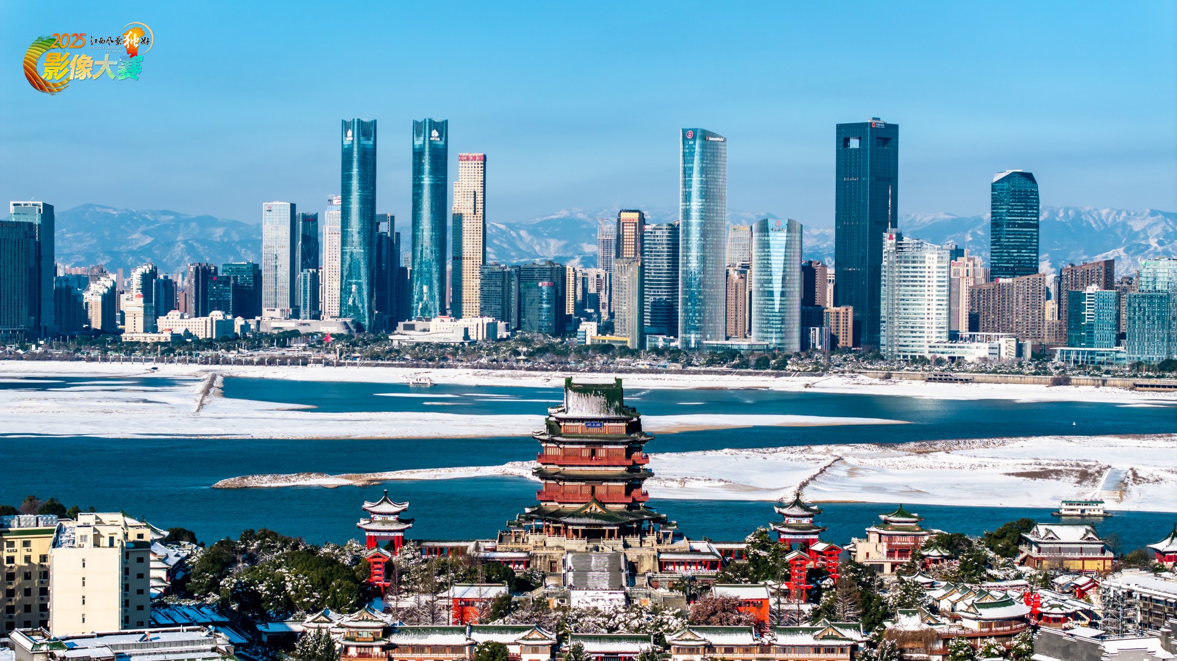 雪落滕王阁,古韵悠然;赣江映高楼,现代与历史在蓝天雪山间交融,尽显南昌的古今之美。2024年1月于滕王阁。