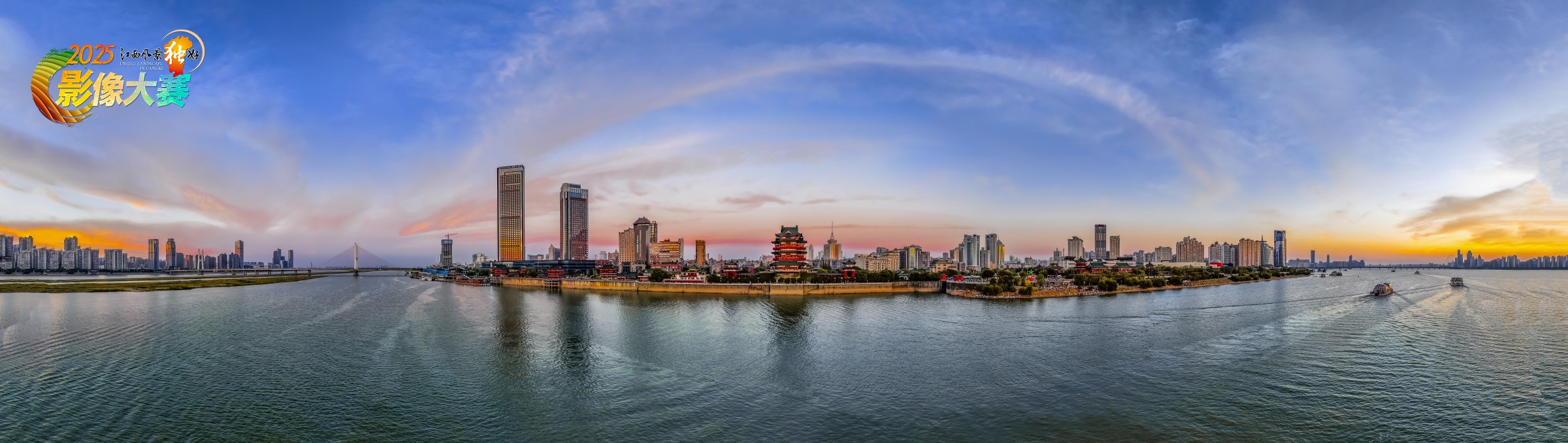 南昌赣江晚霞,江面波光粼粼,滕王阁与现代建筑相映成画,天空染橙红,水天一色,尽显城市古今交融之美。