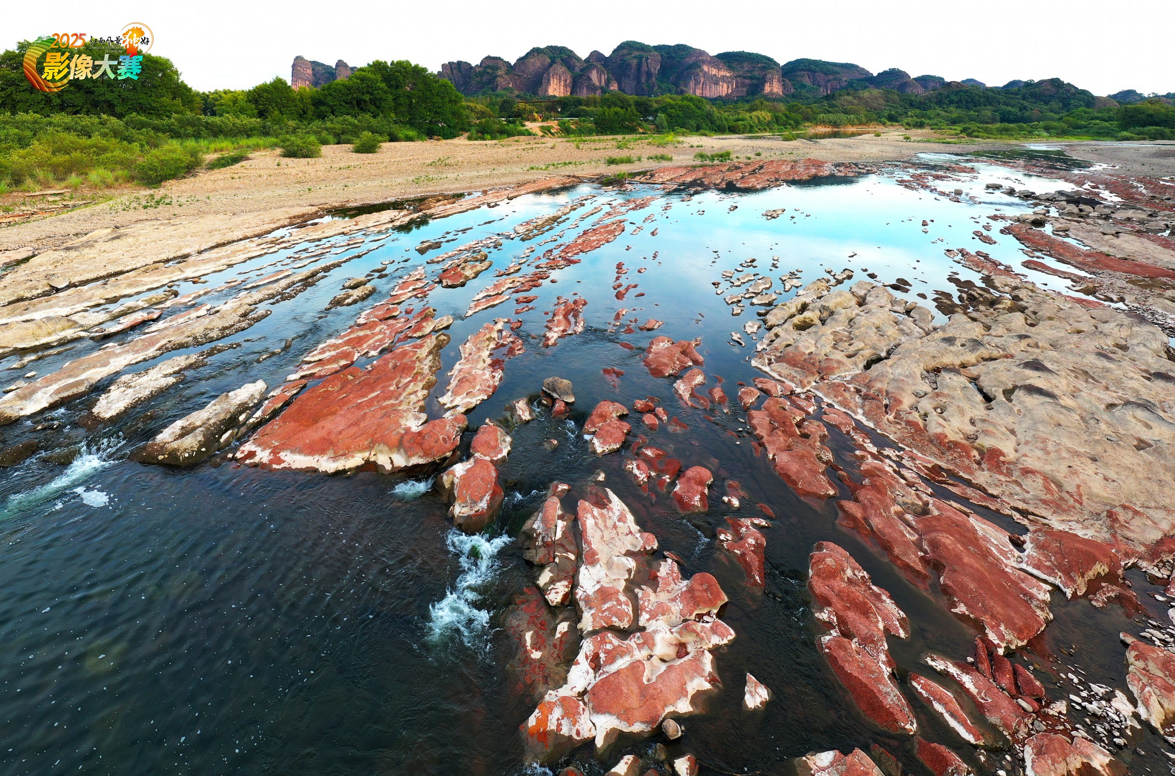 河道水位下降,犹如 “五花肉” 般色彩层次分明的丹霞地貌岩石群得以显现,红色与浅色系岩石交错分布,纹理独特。清澈的河水在形态各异的岩石间蜿蜒流淌,岩石的红与河水的蓝形成鲜明色彩对比。