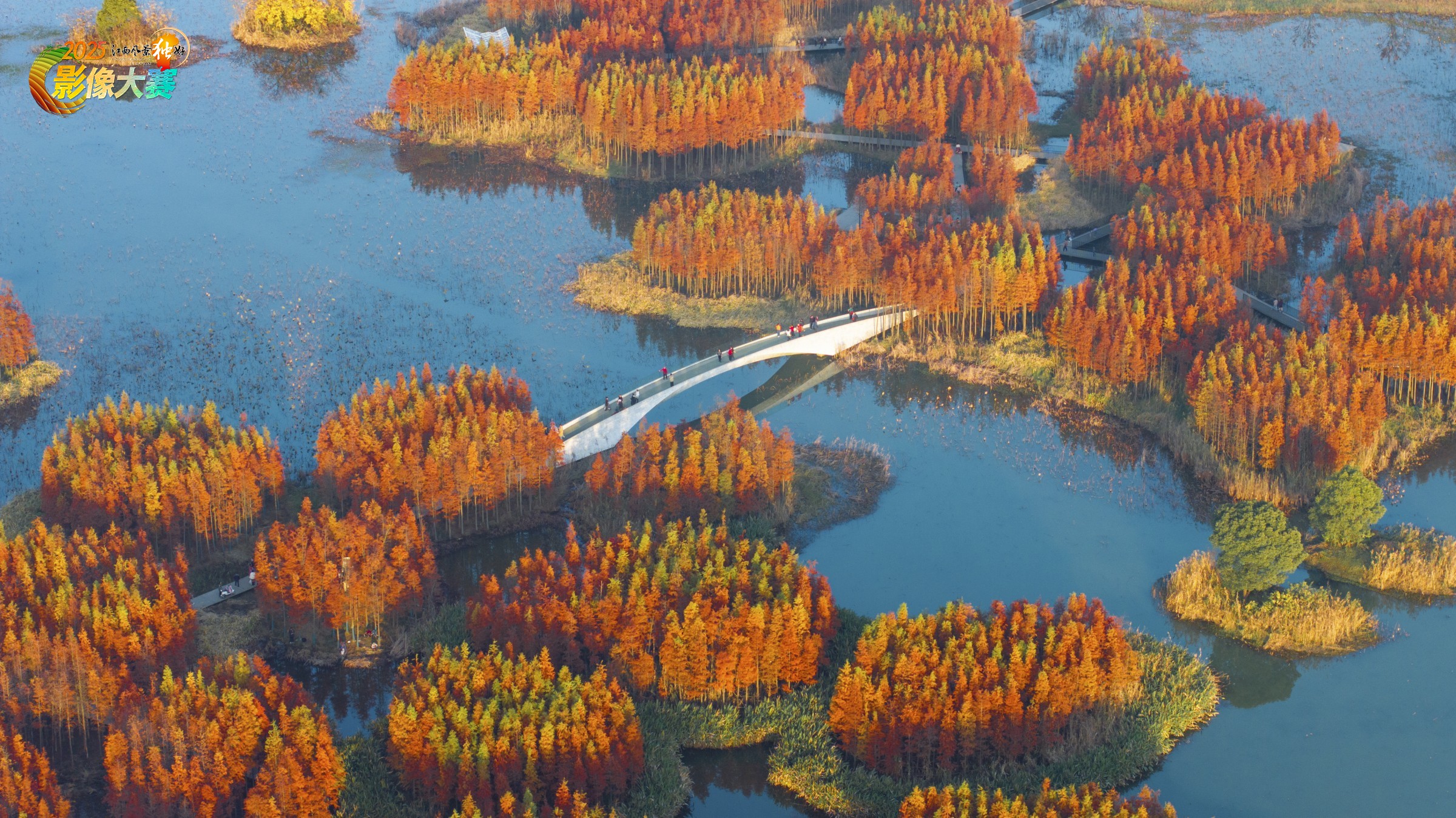 鱼尾洲之秋,湖水如镜,红杉似火,栈道蜿蜒,游人如织,一幅秋日画卷在湖畔缓缓展开。
