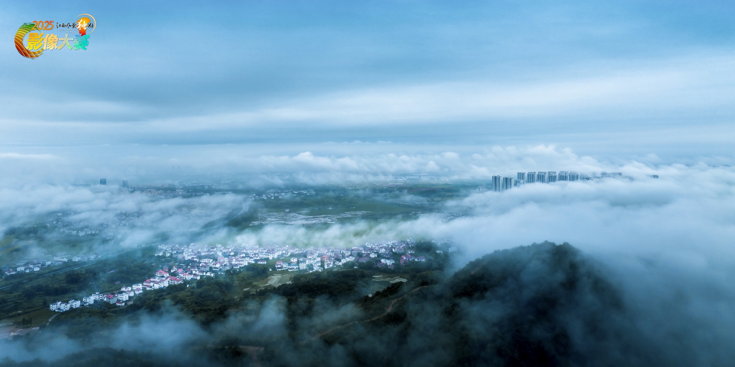 梦山云境,云雾轻绕山间,村落隐于云涛,远处城市与青山相映,宛如仙境,尽显自然与人文的和谐之美。