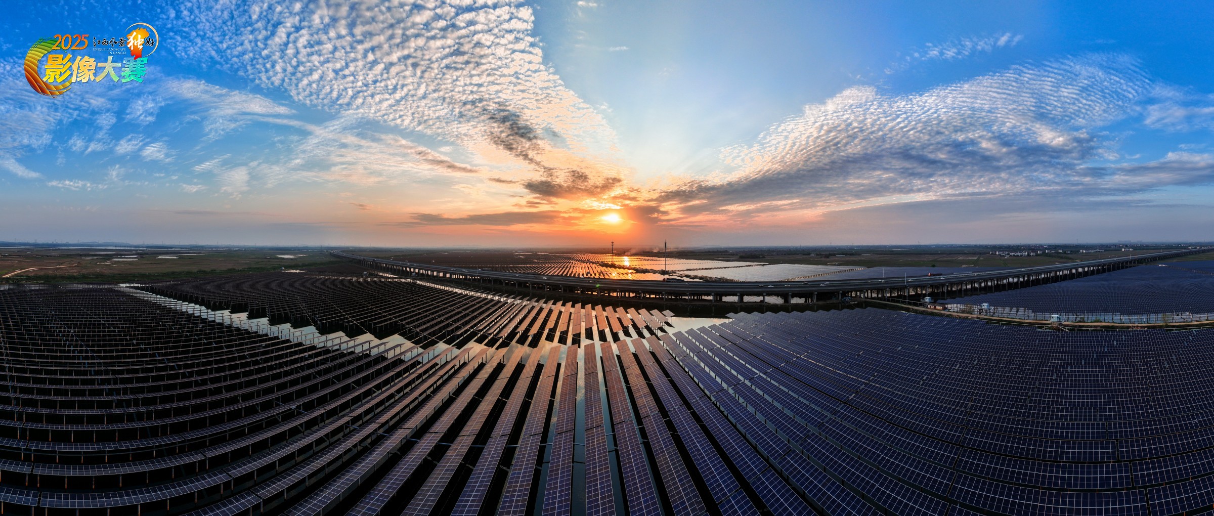 金色晚霞漫过天际,光伏板如镜面般铺展,在余晖里闪烁微光。水面与光影交织,勾勒出能源与自然的温柔对话,宁静而充满希望。