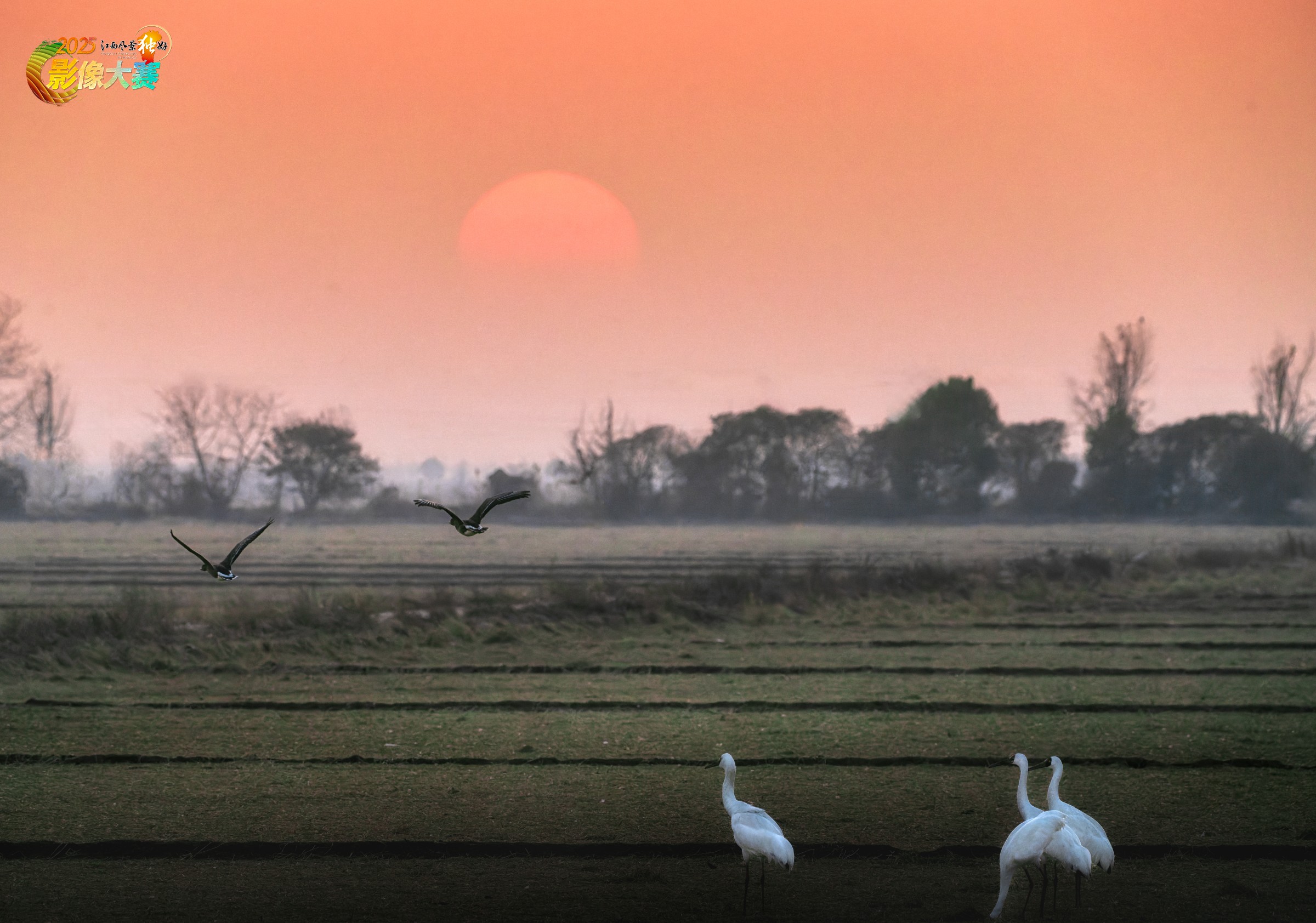使用长焦镜头拍摄于春节前夕的鄱阳湖水域。在日复一日的城市生活中,我始终渴望捕捉那些稍纵即逝的自然瞬间——当夕阳将田野染成蜜糖色,白鸟群起盘旋的刹那,正是天、地、生灵三者对话的黄金时刻。拍摄时,我一直在思考,如何同过画面自然元素的有机组合构建多重象征体系:白鸟的群体行为隐喻生命律动,落日的时空定位暗喻时光流逝,而田野的肌理肌理则象征大地的永恒性。希望能传递出对自然和谐的礼赞,又隐含对生命瞬息性的哲学思考。