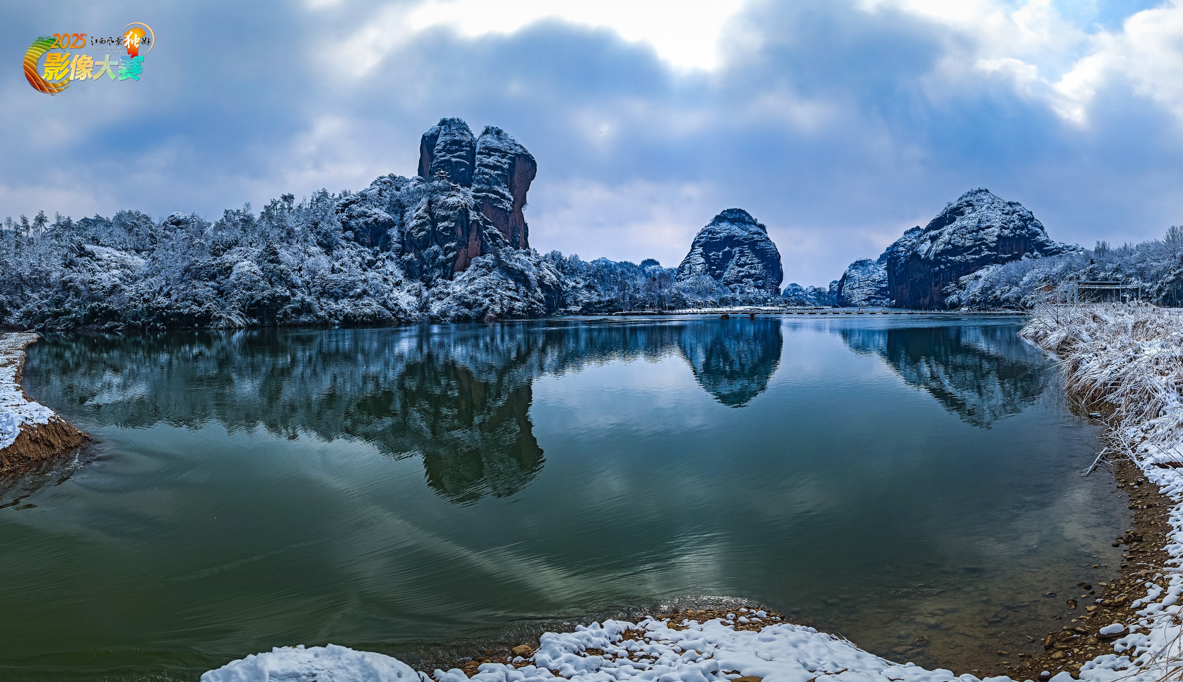 手机全景模式拍摄雪景中的龙虎山仙岩