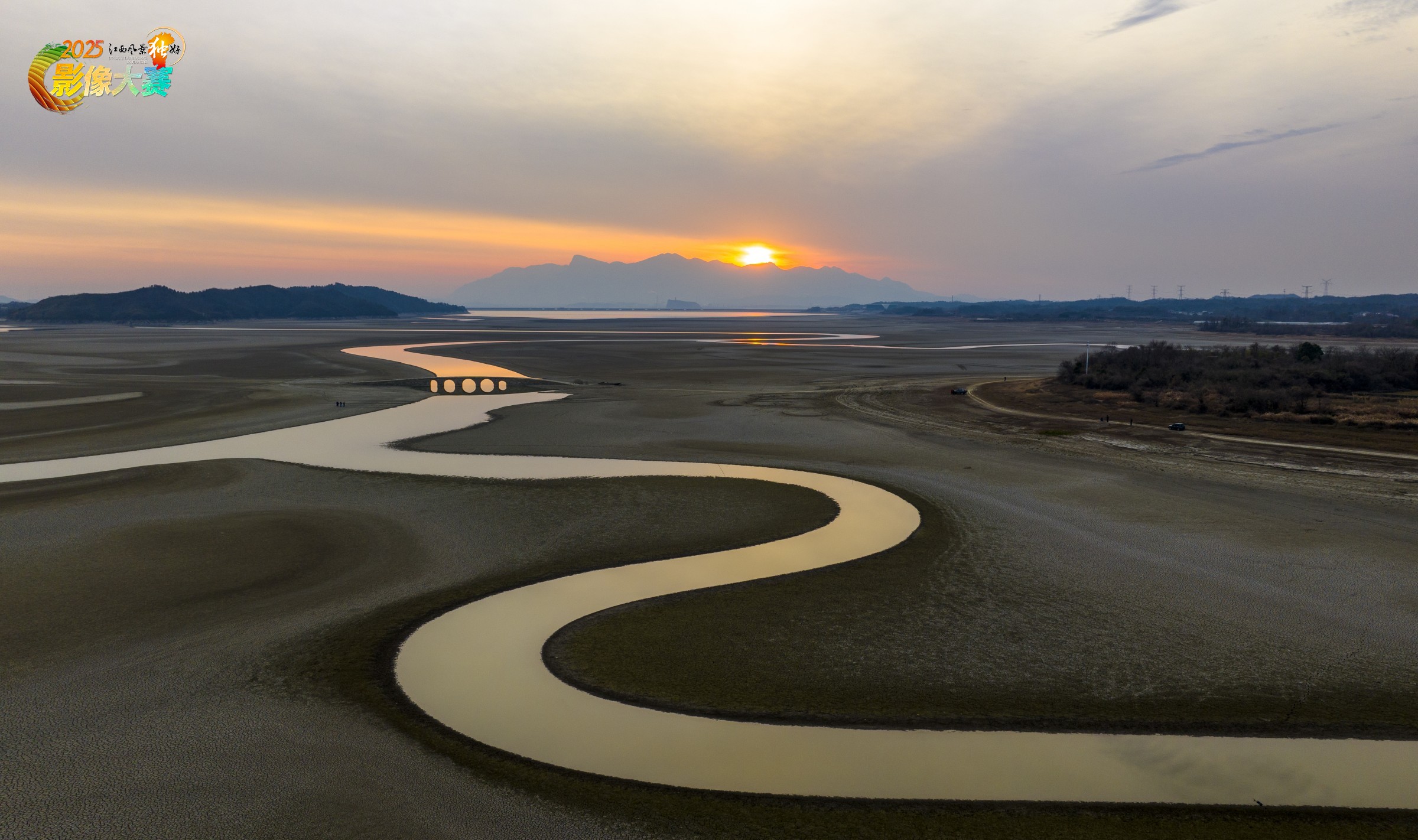 太阳的余晖洒在干涸的鄱阳湖弯曲的水面上,水面退去五眼桥重新露出来,远处的鞋山和庐山依稀可见。