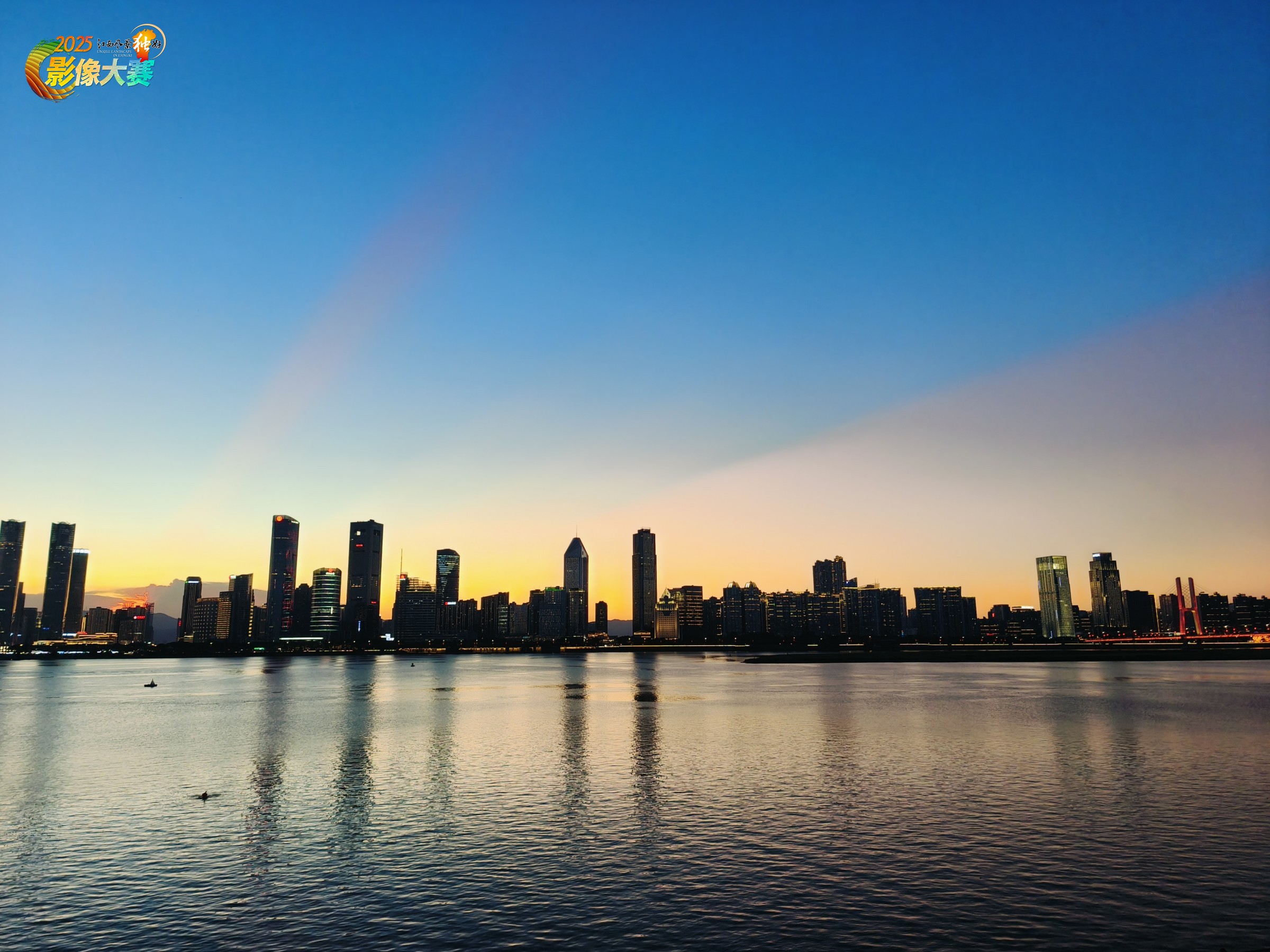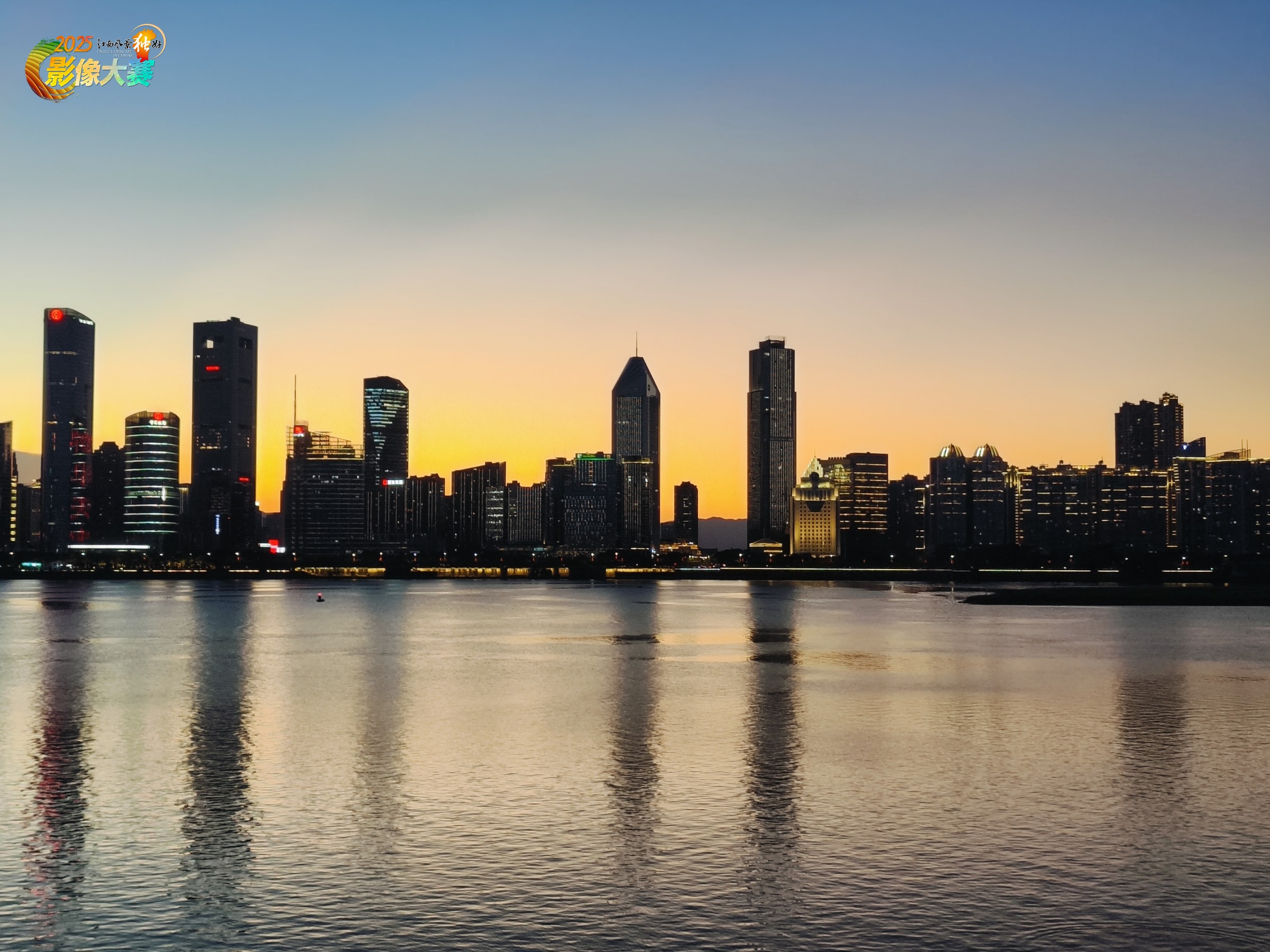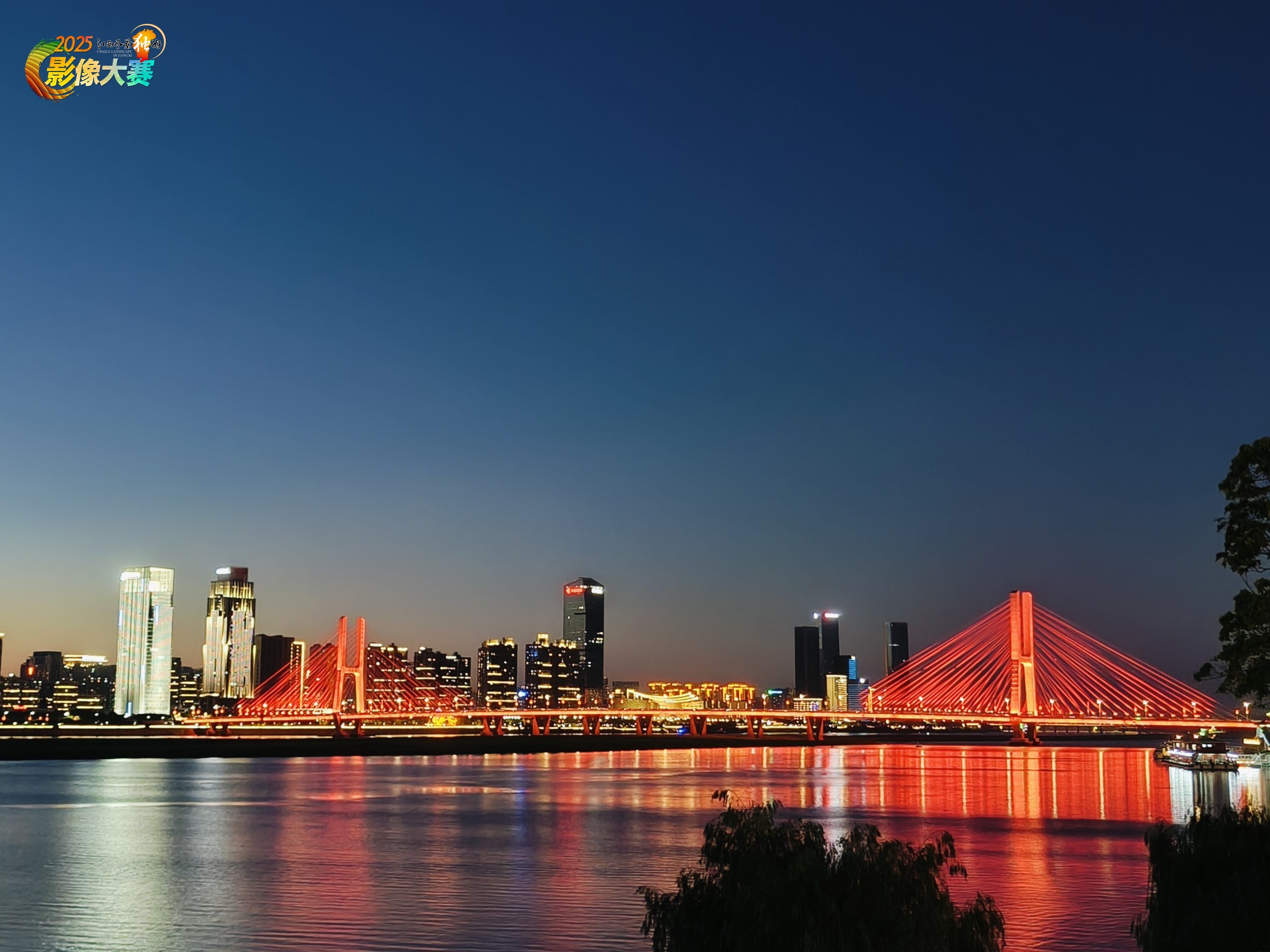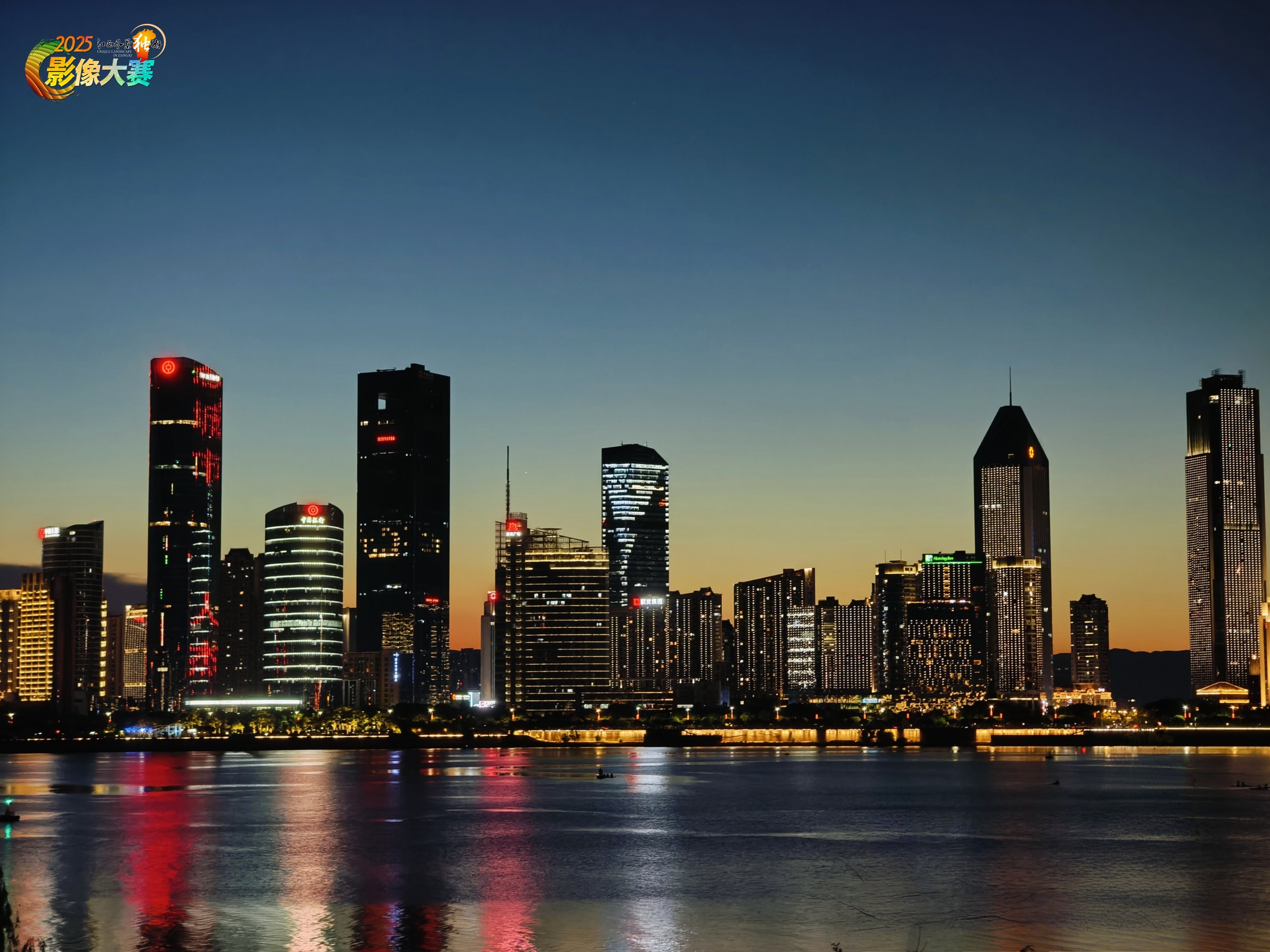 赣江江面如镜,倒映着岸边鳞次栉比的摩天楼宇,建筑上的灯光或明或暗、色彩丰富,与渐暗的天空形成鲜明对比,展现出南昌现代化的繁华风貌与独特的夜间魅力,既彰显了红谷滩作为南昌新城区的蓬勃发展态势,也传递出都市夜晚独有的静谧与活力交融的氛围。