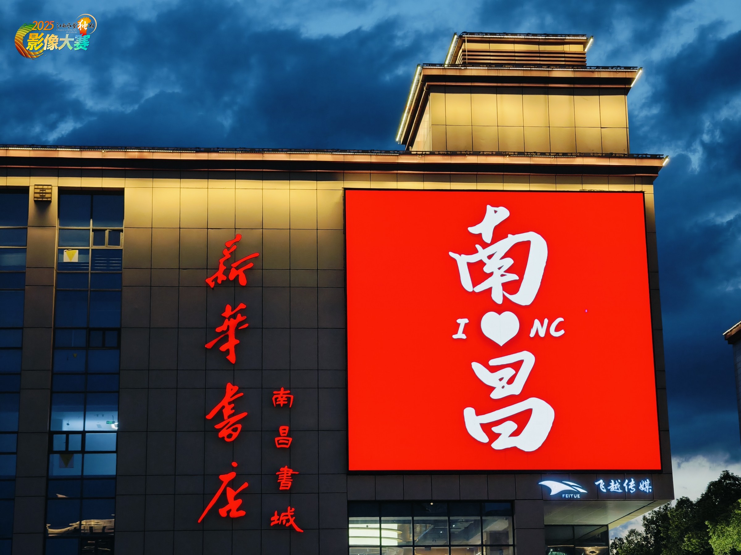 画面中红色的“南昌书城”字样与醒目的“我爱南昌”主题相互映衬,在深蓝色的夜空背景下格外夺目。它既体现出南昌这座城市的文化书香氛围,又通过“我爱南昌”的表达传递出对这座城市的热爱与眷恋,展现出南昌在夜晚时分兼具文化气息与城市情怀的独特风貌。