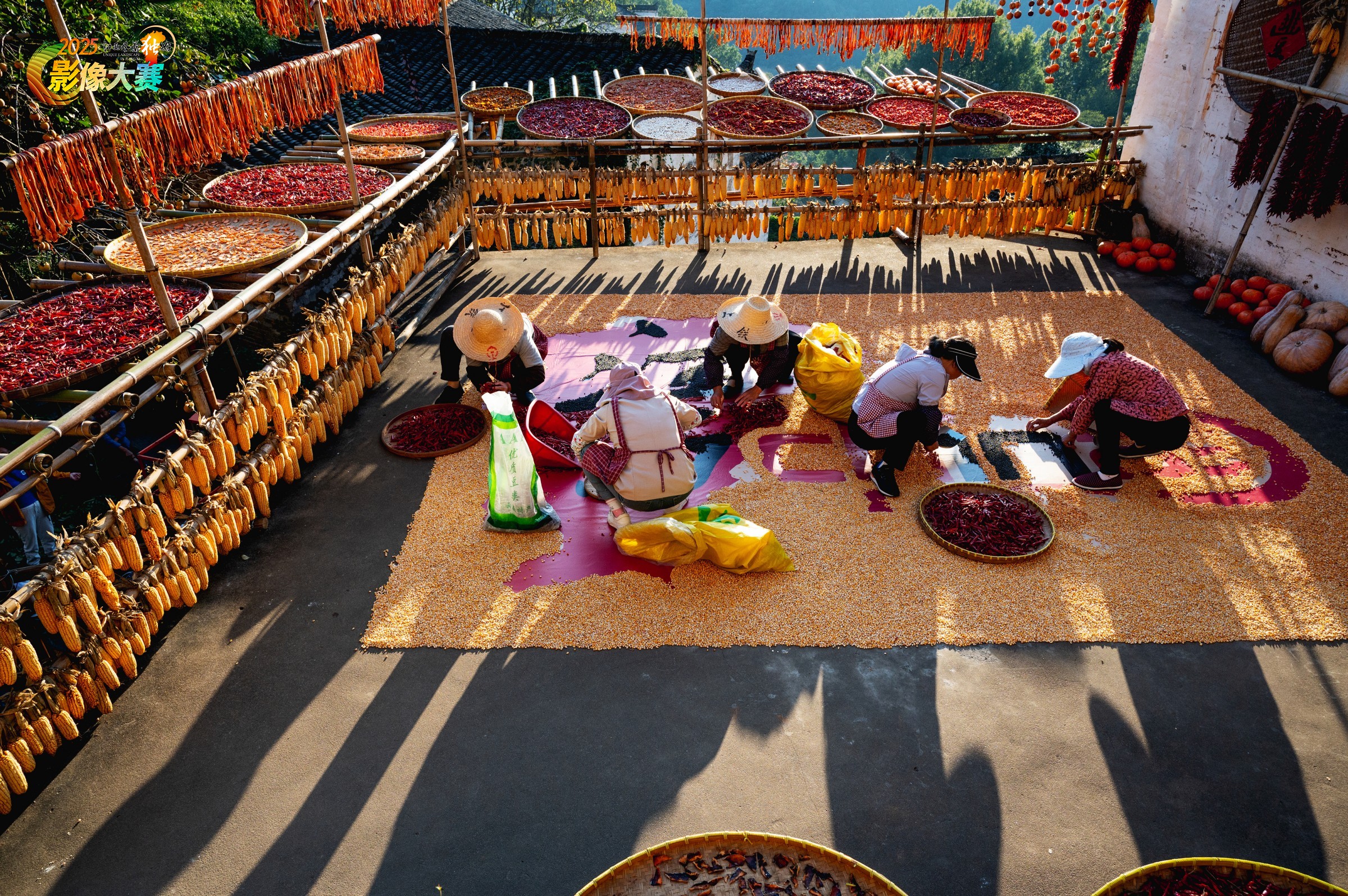 篁岭晒秋,源于先民依山而居、就地取材的智慧。晒秋晒的不仅是丰收的果实,更是村民对红火日子、五谷丰登的美好期盼。 如今,村民手中的晒匾,已成为推动当地乡村振兴的重要引擎。篁岭以“晒秋”为核心IP,推动“非遗+文旅”深度融合,建设晒秋观景平台、农俗文化展馆、秋晒体验工坊等,那一匾匾辣椒、玉米、南瓜拼合出的斑斓图案,不仅晒出了农民丰收的喜悦,更晒出了农业农村现代化的蓬勃生机,成为赣鄱大地庆祝丰收节的最生动注脚。