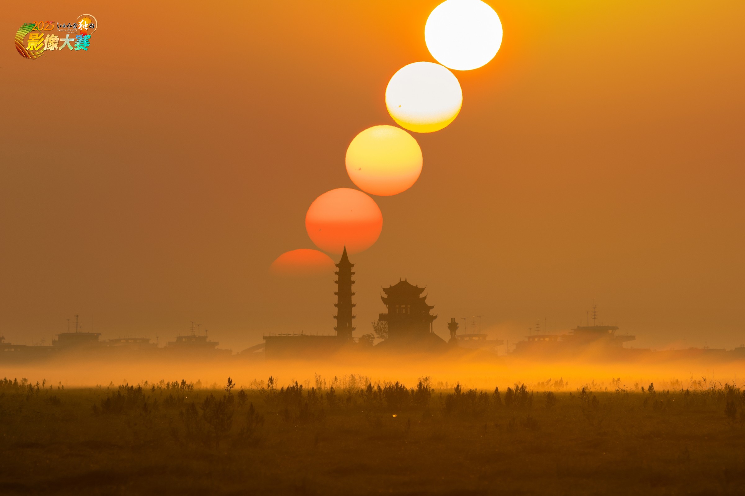 落星墩位于江西省九江市庐山市紫阳堤南二里鄱阳湖中心,汛期时四面环水,枯季则可步行至其上,是鄱阳湖地标性建筑。 初夏,落星墩四周的草滩还未被湖水淹没,太阳从东南方升起,蒸发起一层薄薄的晨雾,在鄱阳湖滩上弥漫。
