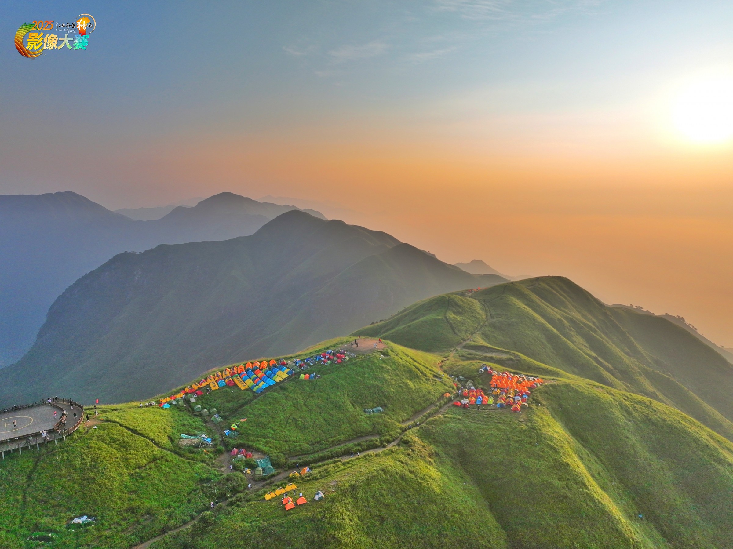 江西省萍乡市武功山,随着东方天际泛起第一缕微光,墨蓝的天幕渐次被染成橘粉、金红,云层像被点燃的棉絮,层层叠叠铺展开来。
