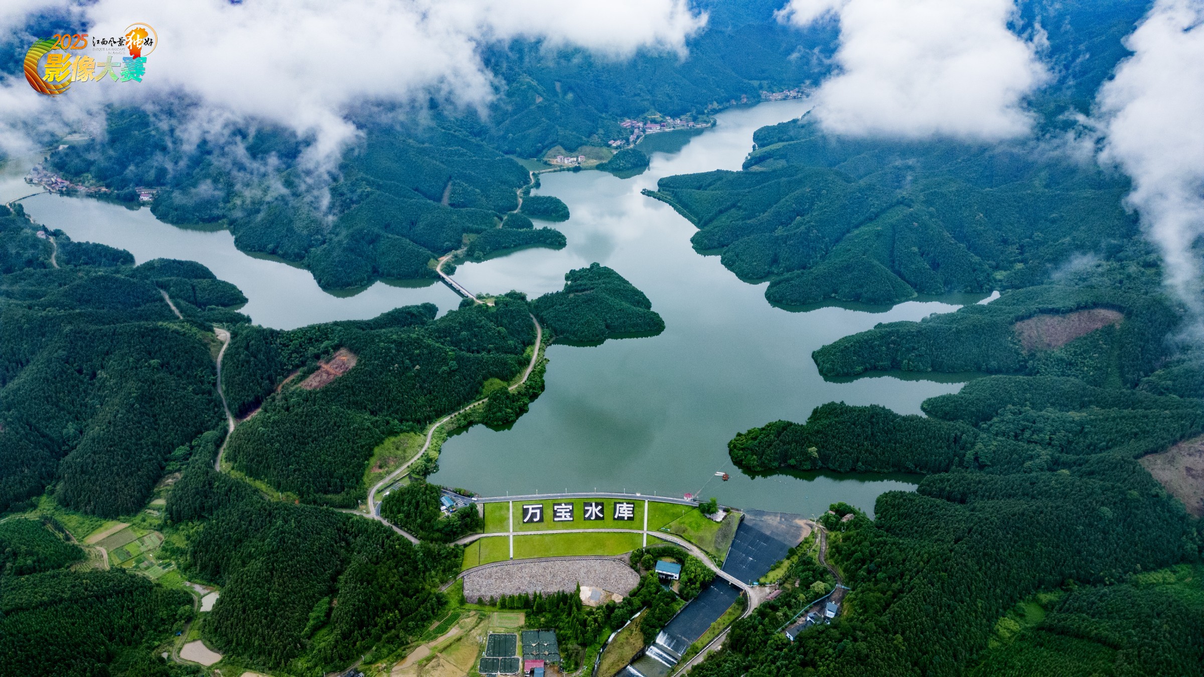 这张图片展示的是峡江县万宝水库的航拍景观。画面中,水库的水域在群山与森林的环绕下,呈现出蜿蜒灵动的形态,水面澄澈,与周围郁郁葱葱的绿色山林相映成趣。云雾在山间飘荡,为这片山水增添了几分朦胧的诗意。水库坝区的 “万宝水库” 标识清晰可见,周边还分布着一些建筑与道路,展现出这里的水利工程设施与自然环境的融合,整体画面充满了生态之美与人文建设的和谐感。