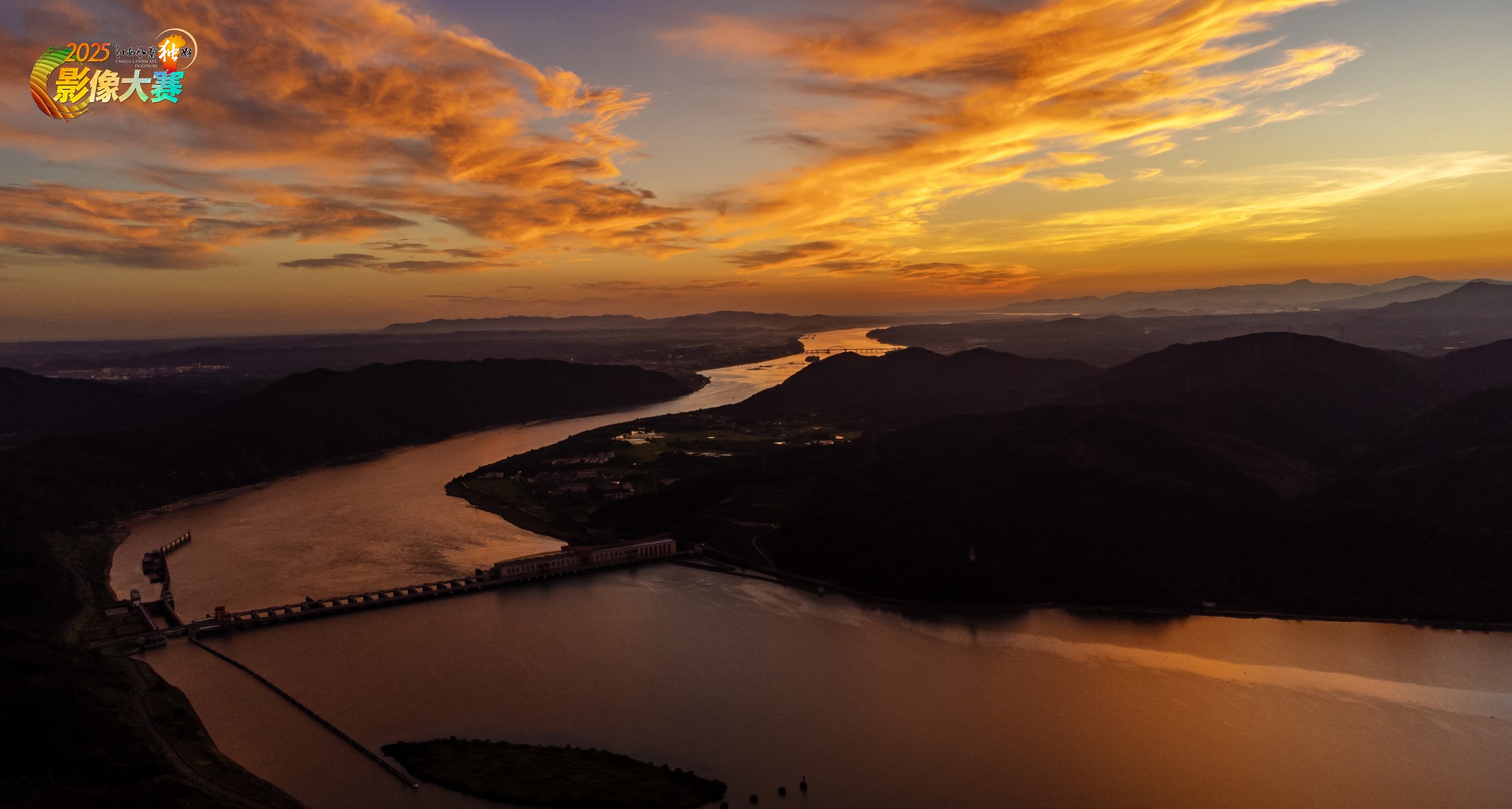 这张图片拍摄于峡江县水利枢纽的日落景观,画面中,赣江蜿蜒流淌,水面在夕阳余晖的映照下泛着暖金色的光泽。赣江的水利枢纽大坝与自然山水融为一体,远处的山峦在暮色中连绵起伏,天空中绚烂的晚霞如彩绸般铺展,从橙红到金黄渐变,整个场景大气磅礴又充满诗意,展现出自然景观与水利工程和谐交融的壮美画面,仿佛一幅瑰丽的山水日落油画。