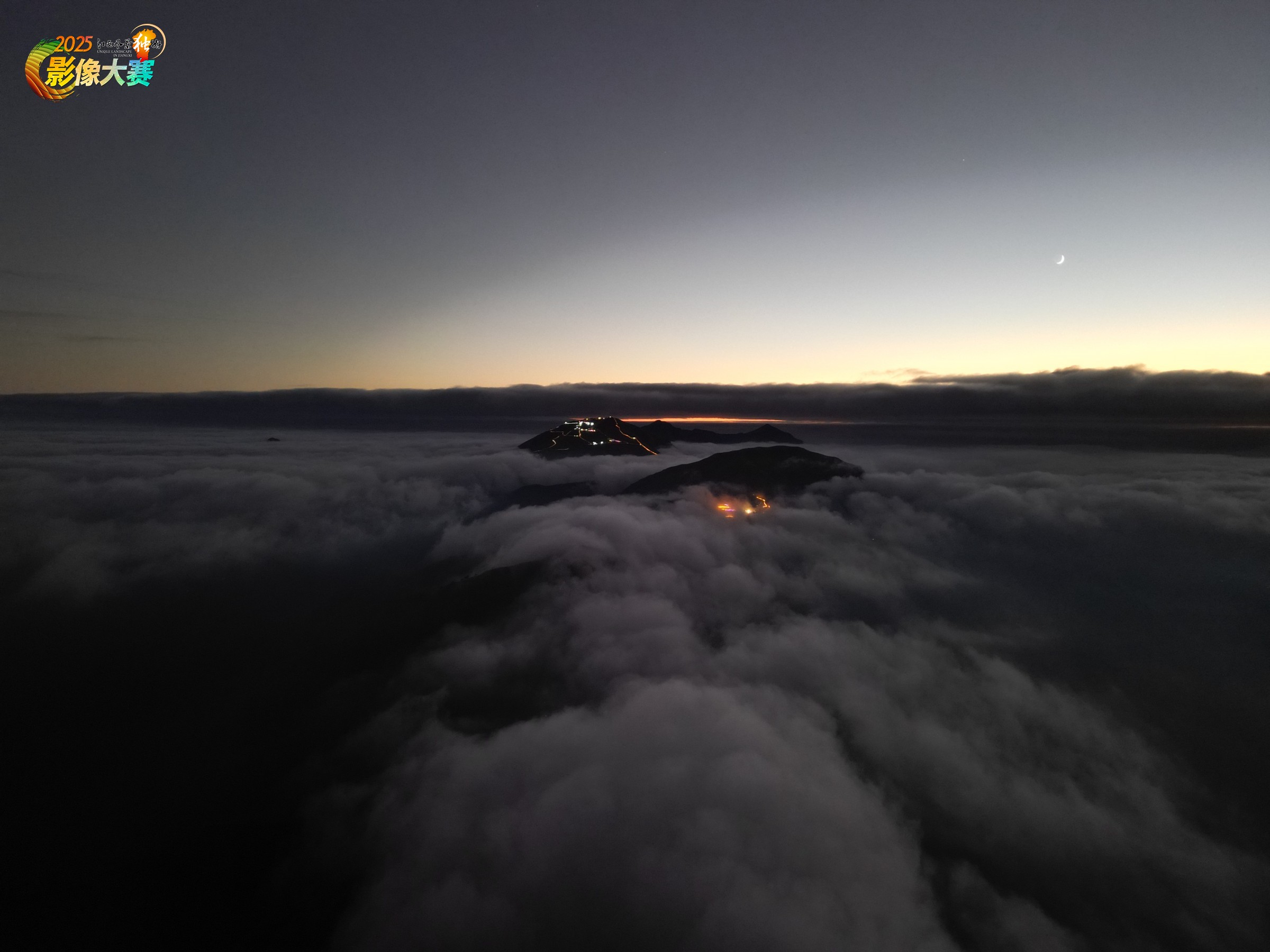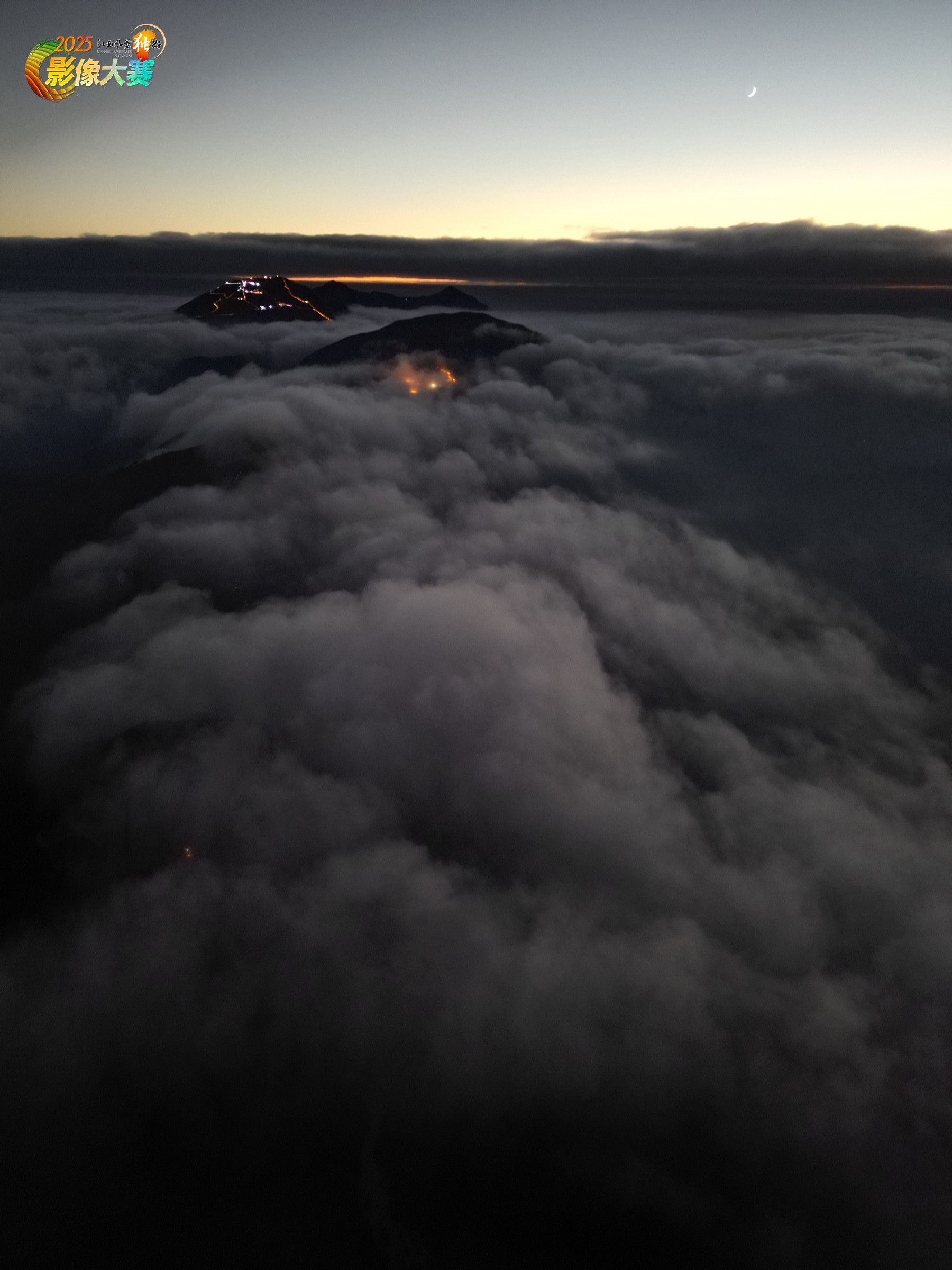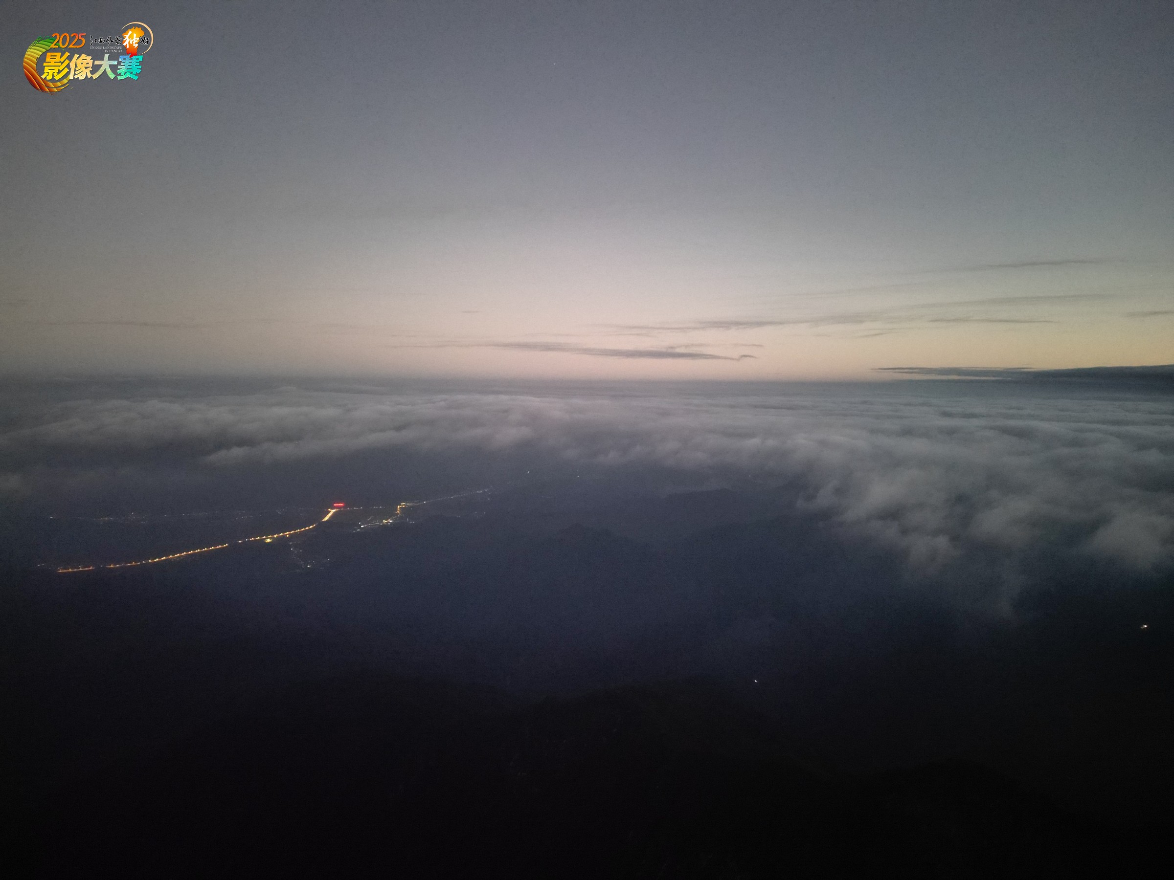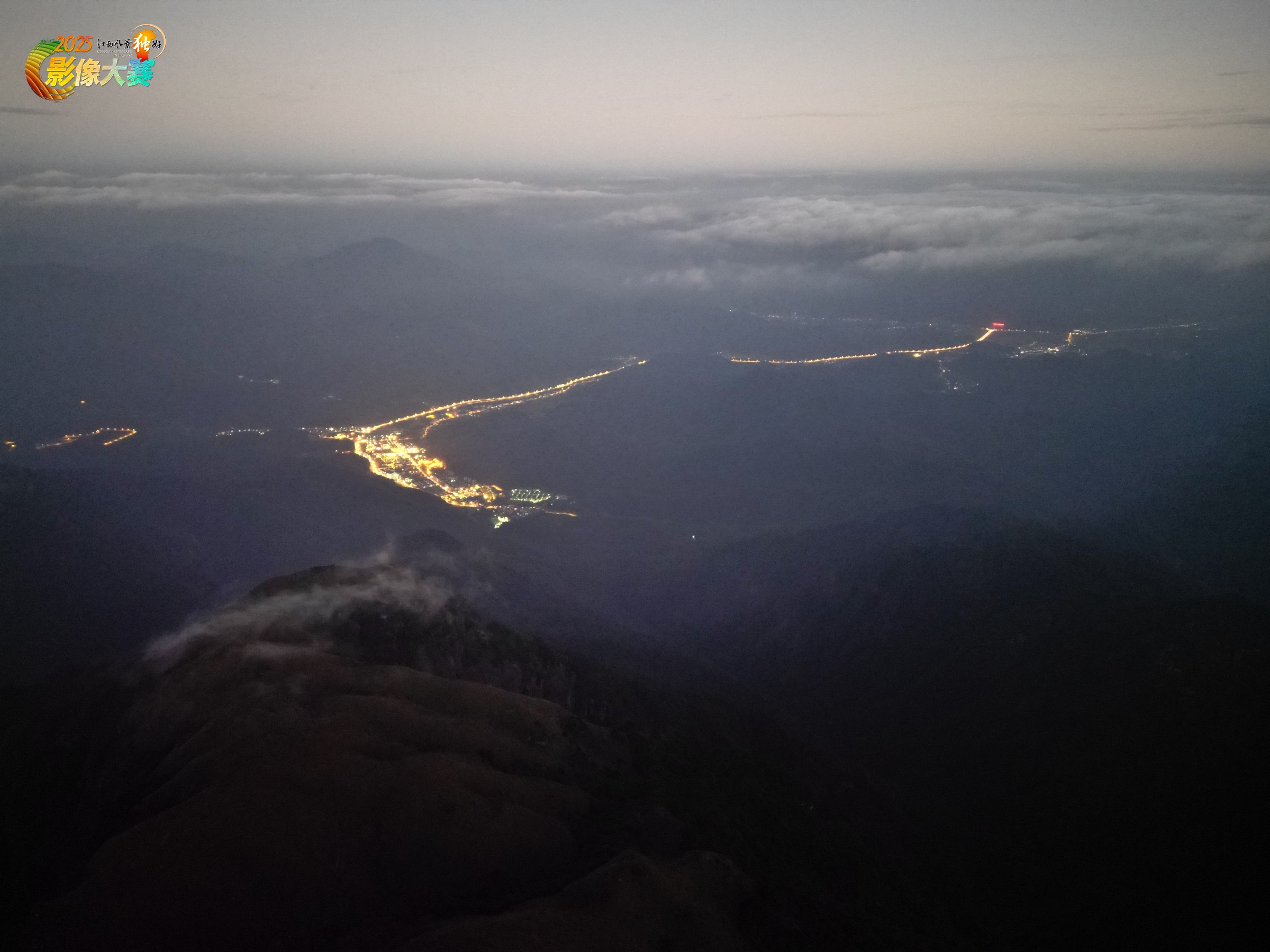 武功山日落的时候,山下,山上,建筑物的亮光。