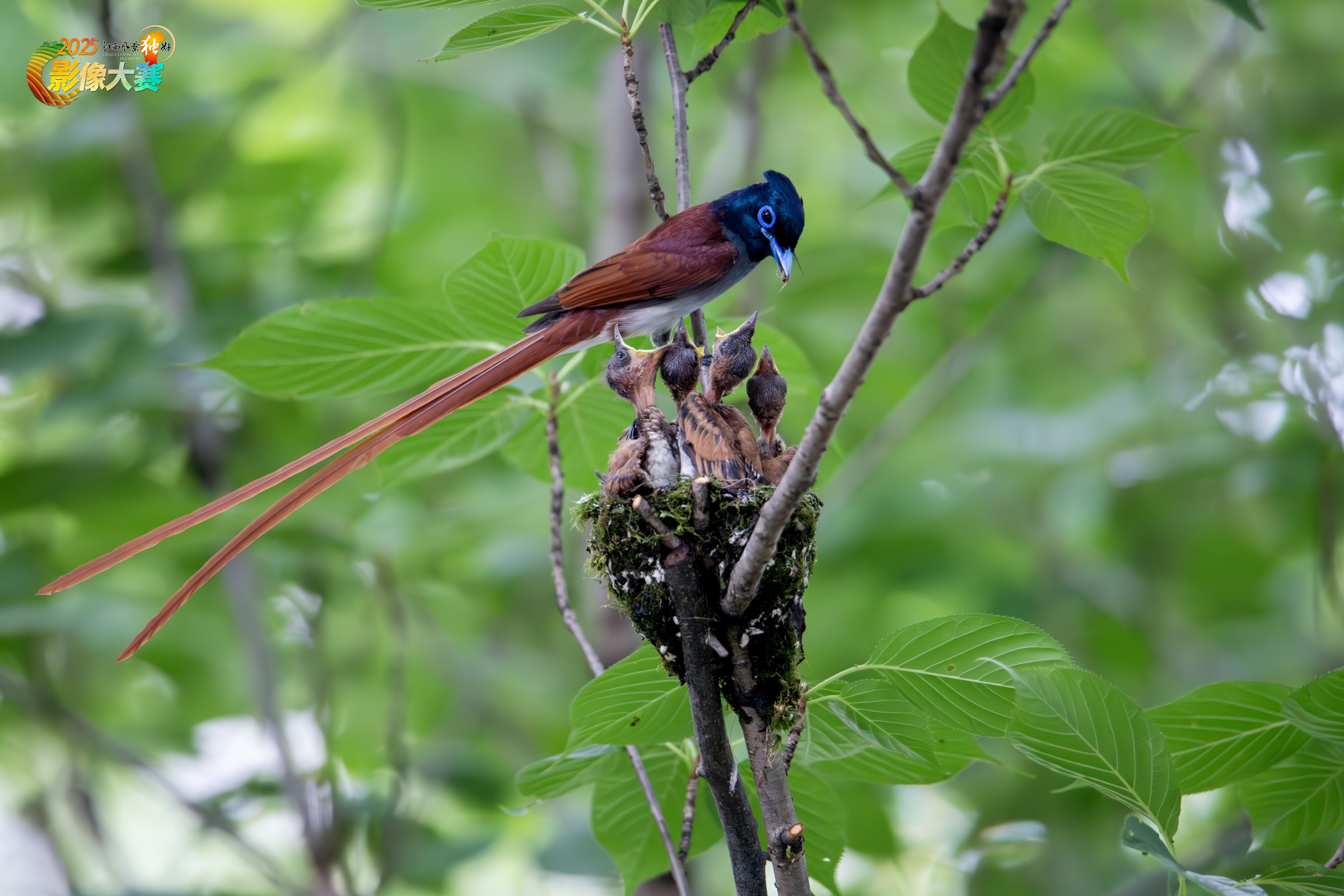 这张图片拍摄于峡江县湿地公园,画面中,一只成年绶带雄鸟正站在巢穴旁,嘴中衔着食物,喂食巢内几只嗷嗷待哺的雏鸟。巢穴由苔藓等筑成,依附在树枝上,周围是茂密的绿色树叶,背景虚化的绿意营造出自然的栖息环境。整个画面充满了生命的温情,生动呈现了鸟类繁衍过程中亲鸟哺育后代的本能,也展现了自然界的细腻与美好。