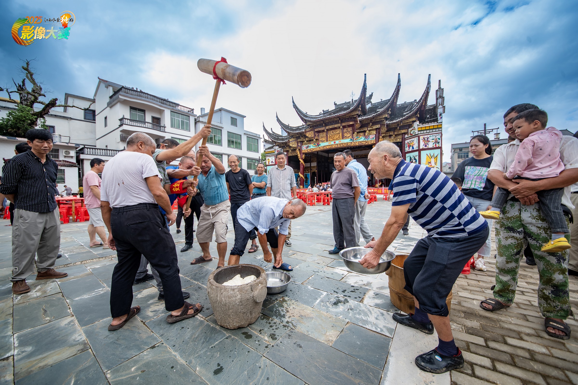 在弋阳的曹溪村,每逢村里的各种喜事,都会在古戏台前宴请村民和八方来客,其中最受欢迎的一道美食就是用糯米蒸熟、众人合力打制的麻子粿。瞧瞧,石臼里的糯米还没打好,就有村民手端盆子迫不及待的在一旁候着了。