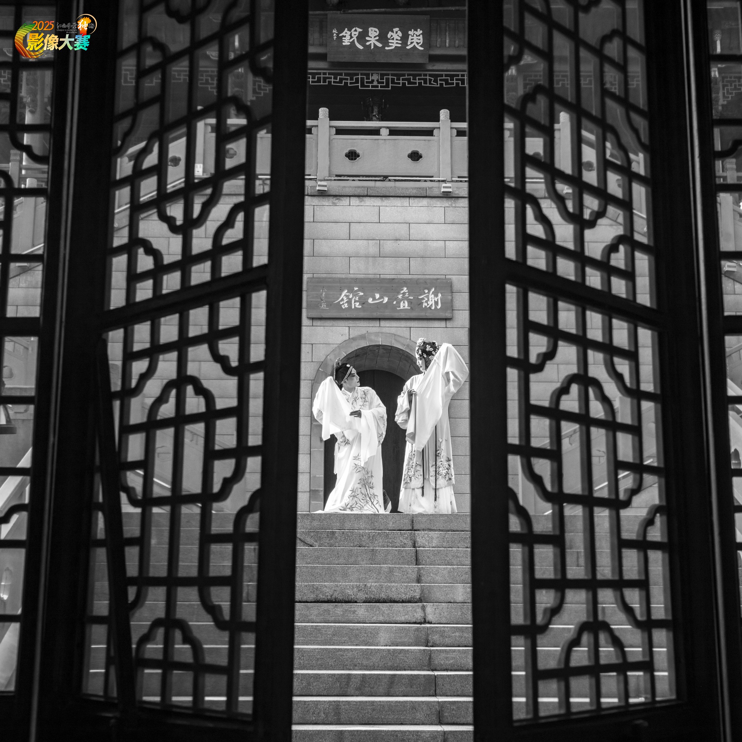 透过中式花窗望去,谢叠山馆前,两位身着传统戏服的演员立于石阶,衣袂飘飘。古建的典雅与戏曲的韵味交融,在黑白影调中,尽显传统文化的雅致与绵长。