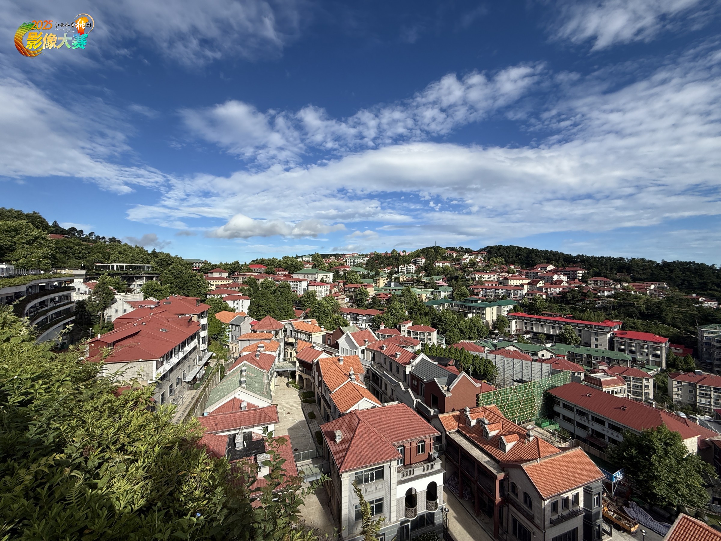 牡岭镇坐落在庐山山腰,7月的清晨,沿着主街走一走,眼前是错落有致的房舍和万里的晴空,令人神清气爽、心旷神怡,非常适合休闲避暑。