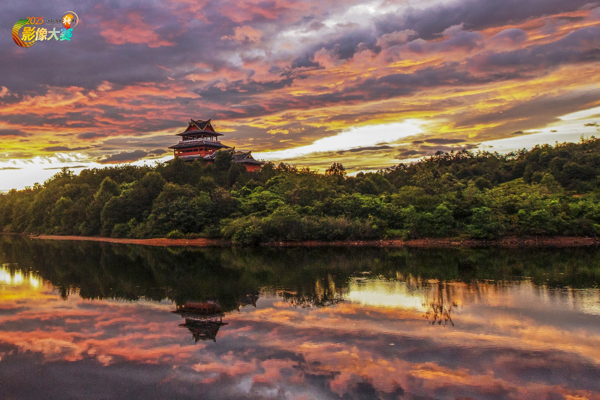 清晨,满天朝霞和楼阁亭台在水中倒映形成一幅美丽画卷。