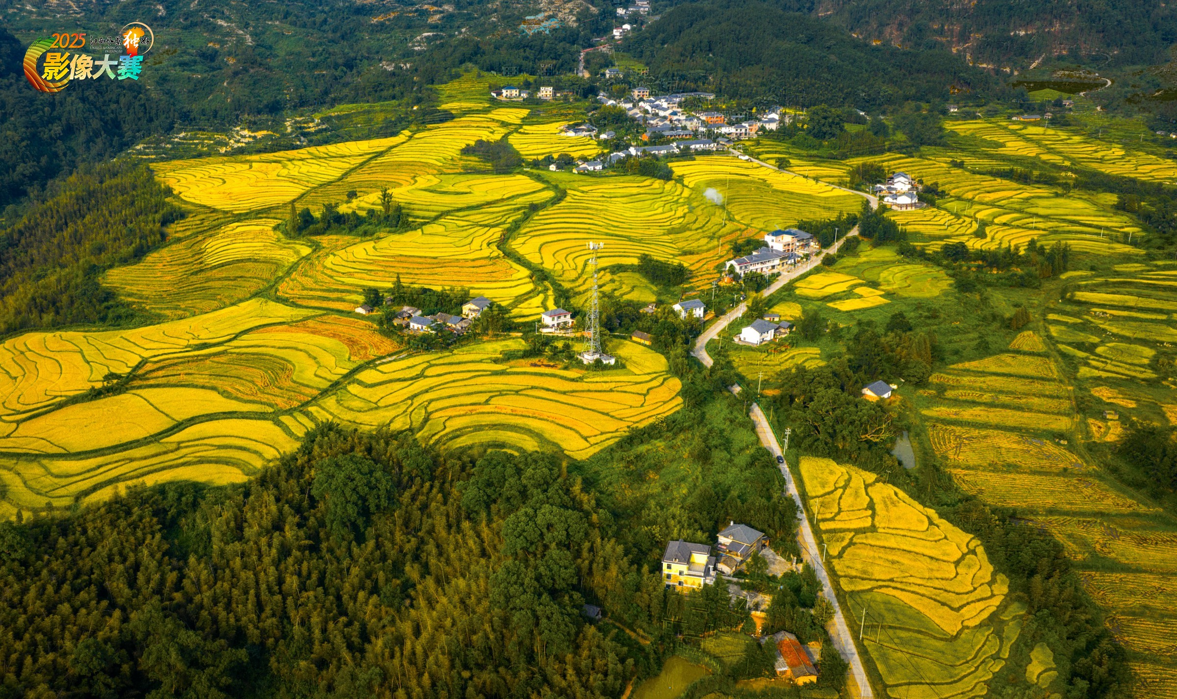 秋收前的潭山梯田,满眼金黄,一派丰收景象,层层梯田依山展开,弯弯曲曲优美伸展,村庄镶嵌其中,一幅乡村美景图画
