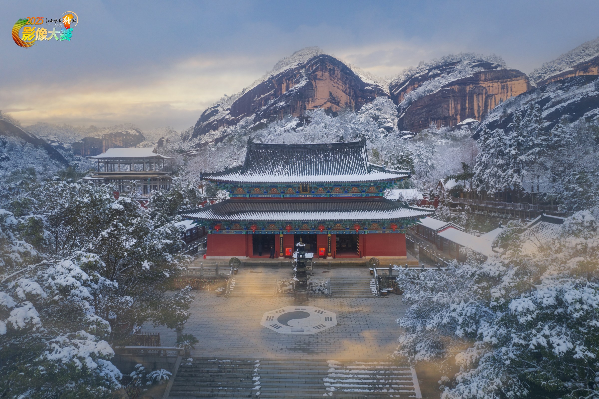航拍雪后龙虎山正一观瑞雪压枝头,风景迷人。