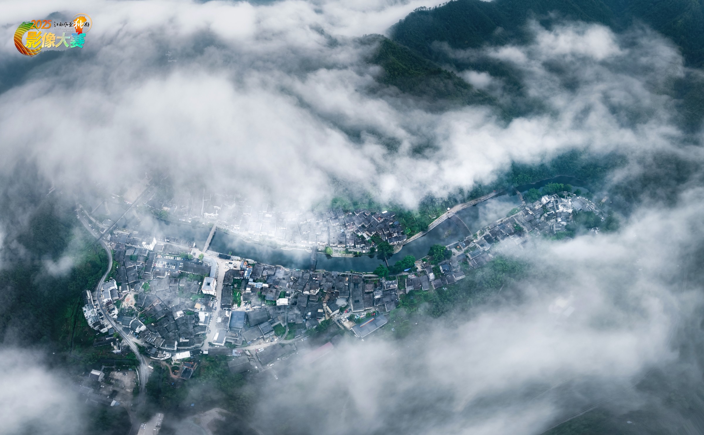 在景德镇瑶里,云雾轻柔笼罩,古镇与碧水青山在云海间若隐若现
