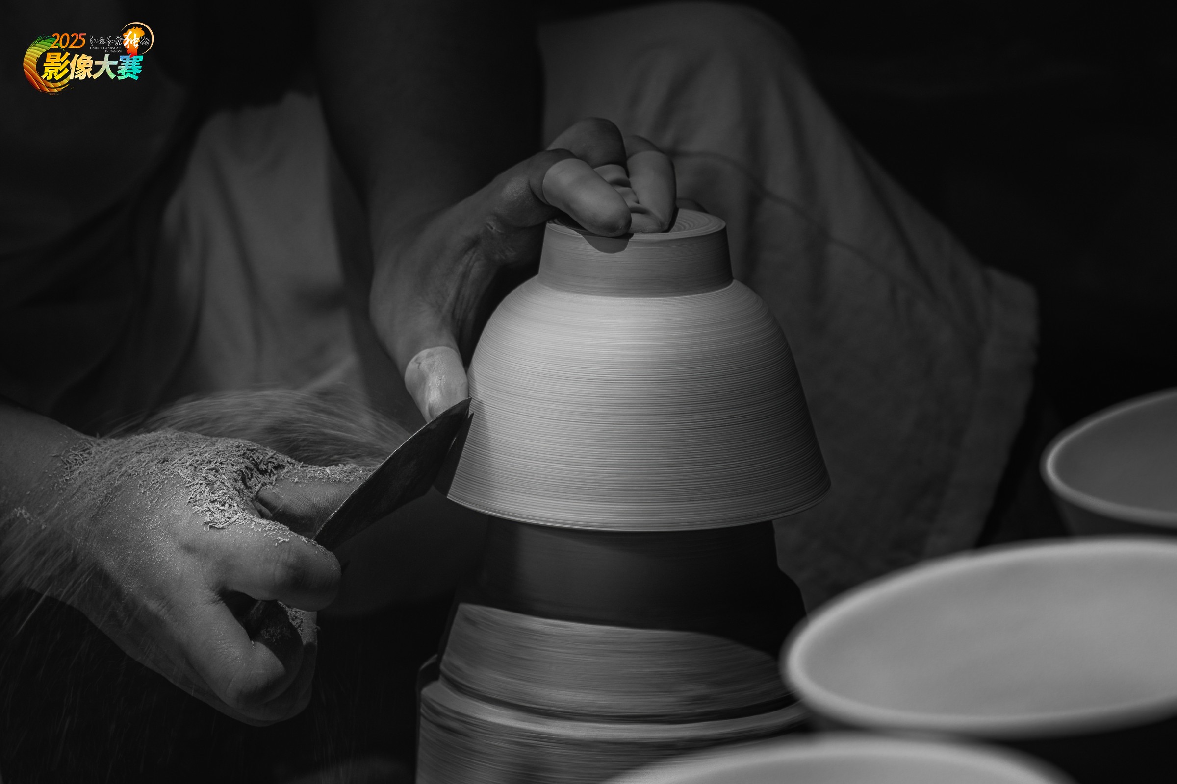 用黑白纪实摄影,匠人双手专注修整陶坯,陶屑飞溅间,尽显传统陶艺制作的精细工艺与匠人之态