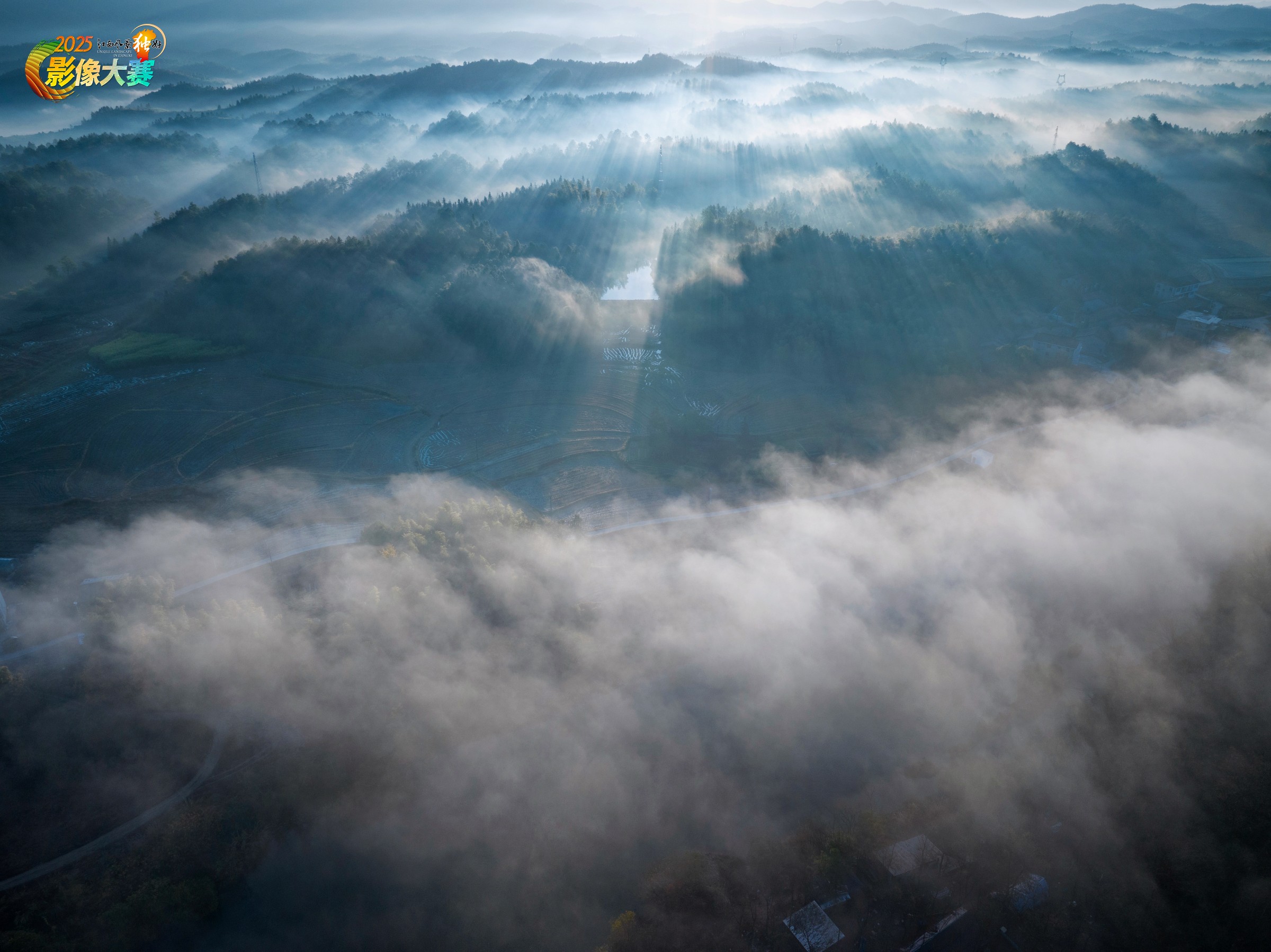 云雾在山林间翻涌,光束穿透雾层洒落,远山、田野若隐若现,宛如仙境般空灵缥缈