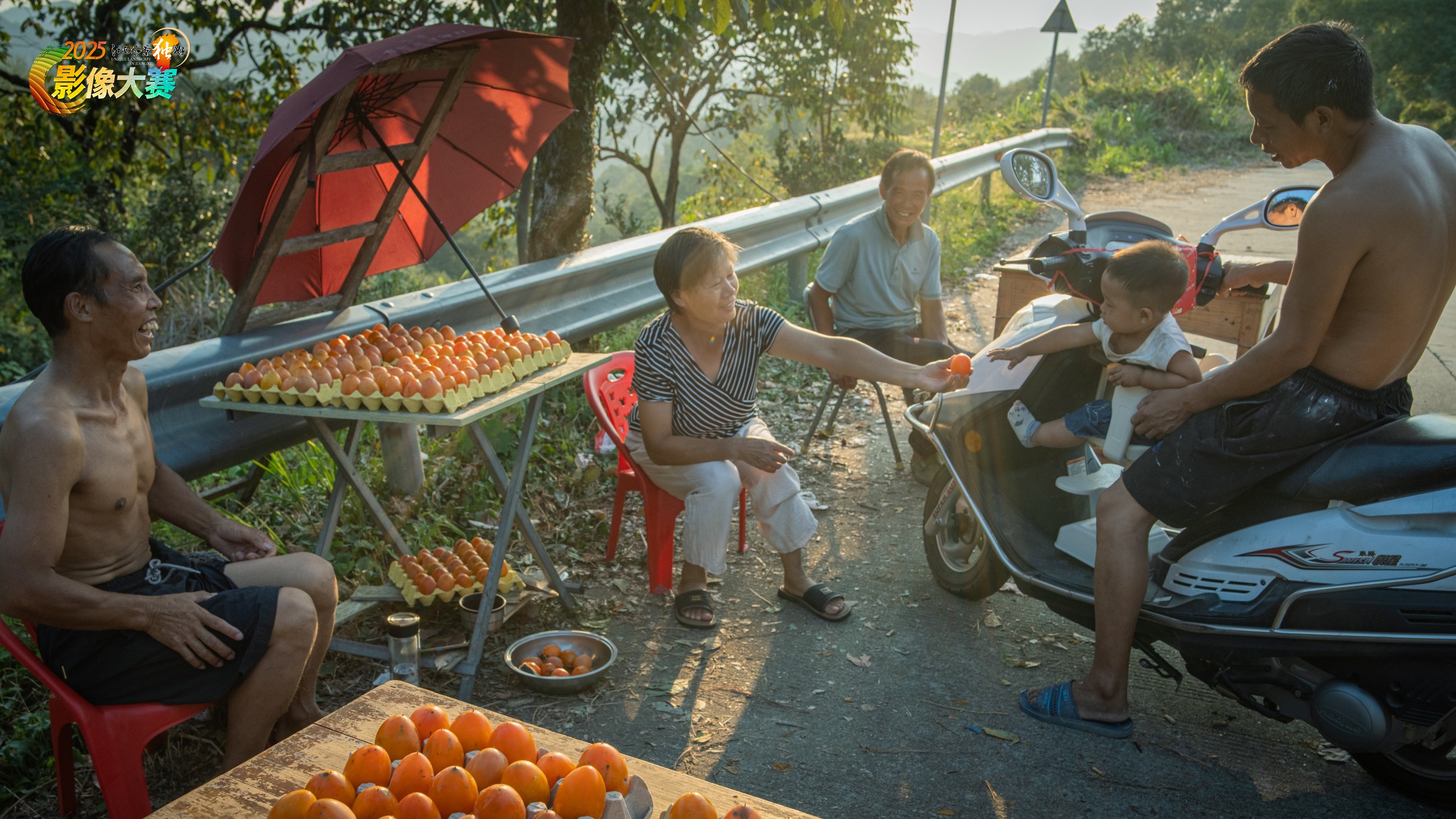 2025年10月12日鄱阳县莲花山的野生鸭蛋柿子熟了,村民在山路边摆摊设点兜售柿子图为村民在用柿子逗玩小孩
