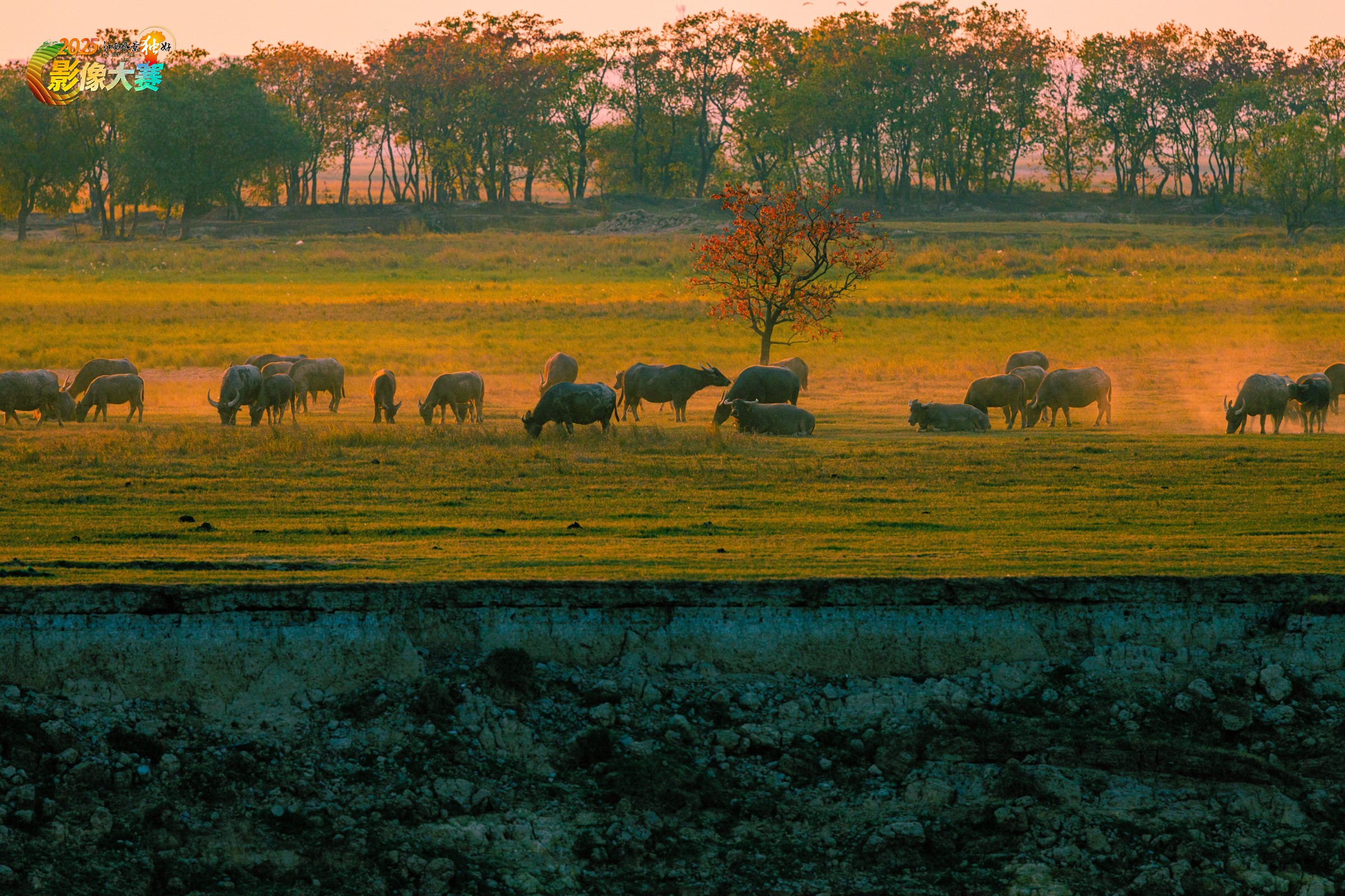 金秋时分一群膘肥体壮的鄱阳湖滨湖水牛在鄱阳县饶州街办养牛牧场悠闲嬉闹