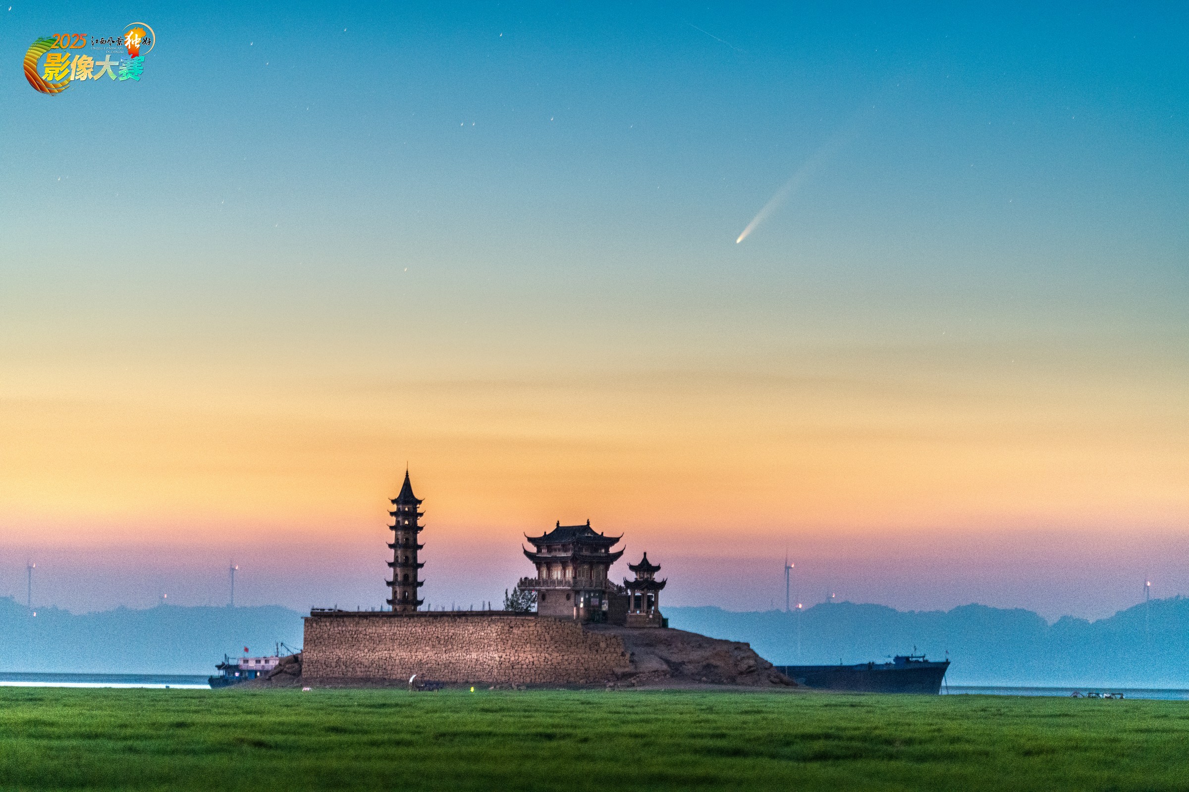 落星墩,位于江西省九江市庐山市(原星子县)鄱阳湖中心,据郦道元《水经注》记载,传为星坠鄱阳湖所化。2024年9月29日凌晨,紫金山阿特拉斯彗星如约而至,从鄱阳湖中的落星墩东方升起。画面仿佛让古老的传说“活”了过来:传说中“坠星”之地,今夜迎来了一颗真正的天外访客。长长的彗尾,正如一颗星辰划破夜空,将千年的想象化为眼前的奇观。这不仅是天文现象的记录,更是对‘江西风景独好’的极致诠释——这里的风景,既有湖岛的千年文脉,也有星空的浪漫馈赠。