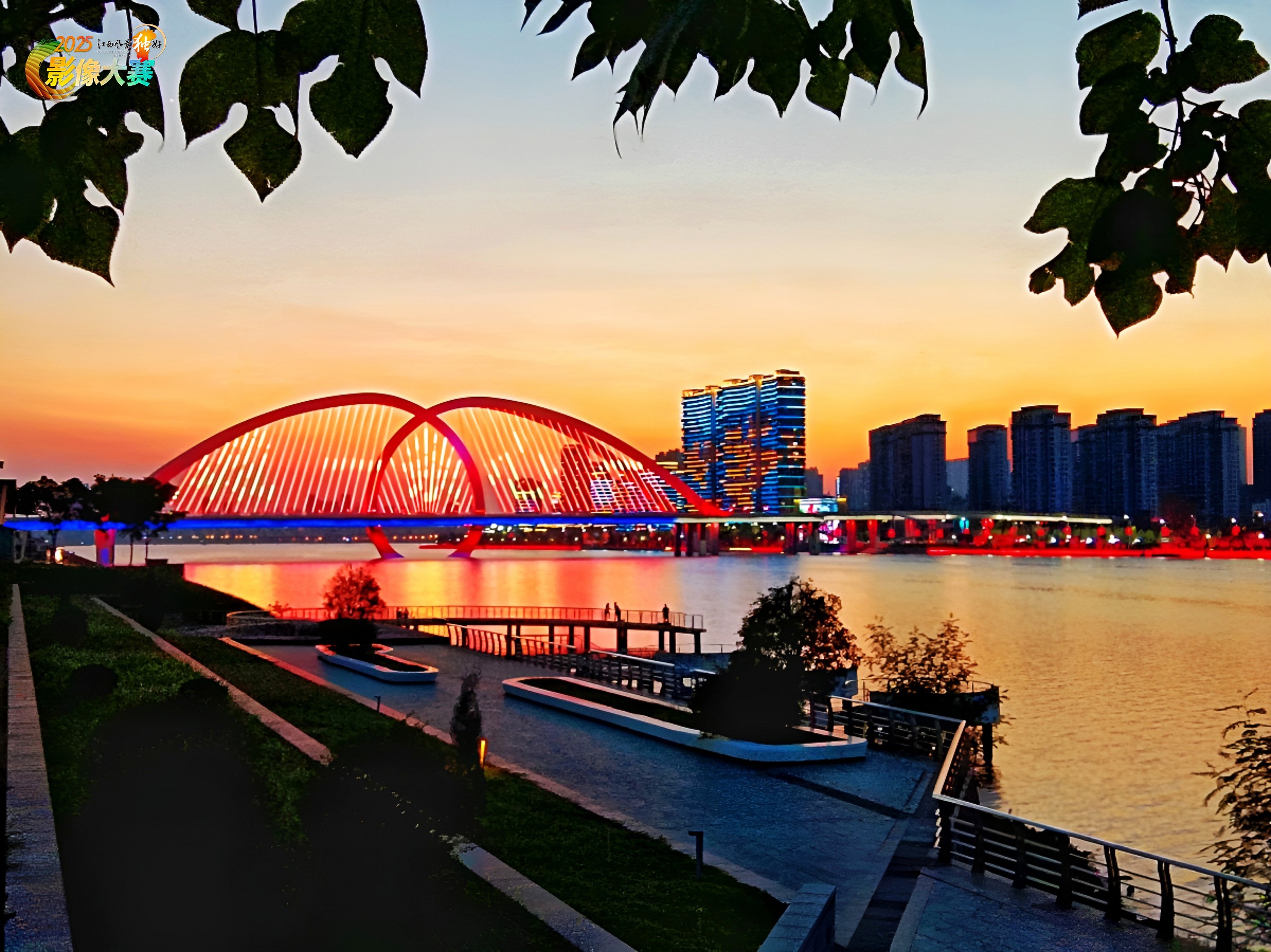 傍晚,灿烂的晚霞把上饶信江照射的波光粼粼,横跨在江面上的旭日彩虹大桥更是蔚为壮观。