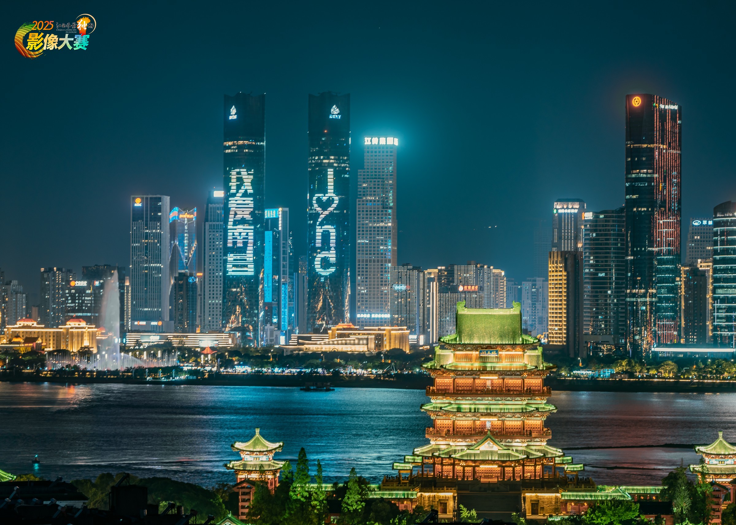 这幅作品以滕王阁为视觉核心,将这座承载千年人文底蕴的江南名楼置于前景,其飞檐翘角、层楼叠榭在灯光下尽显古典雅致。背景则是南昌现代化的城市建筑群,“我爱南昌” 的灯光标语与摩登高楼交相辉映,秋水广场音乐喷泉宛如一曲跨越时空的交响。它巧妙融合了南昌的历史厚度与当代活力,滕王阁的古朴典雅与一江之隔的都市霓虹形成强烈视觉对话,既展现了这座城市对文化根脉的珍视,又彰显出其在时代浪潮中蓬勃的发展姿态,是历史名城与现代都市共生共荣的生动缩影。