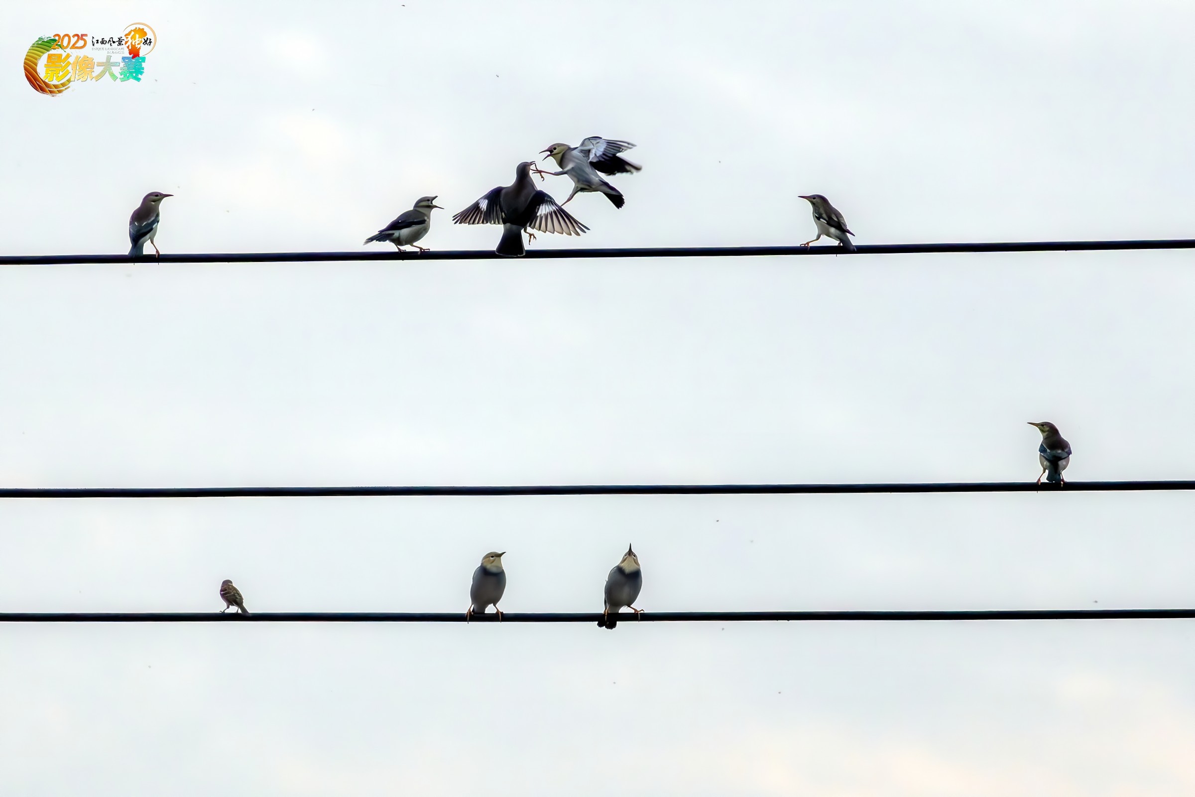 2025年11月2日清晨,江西余干县白鹤洲,小鸟在电线上争斗。