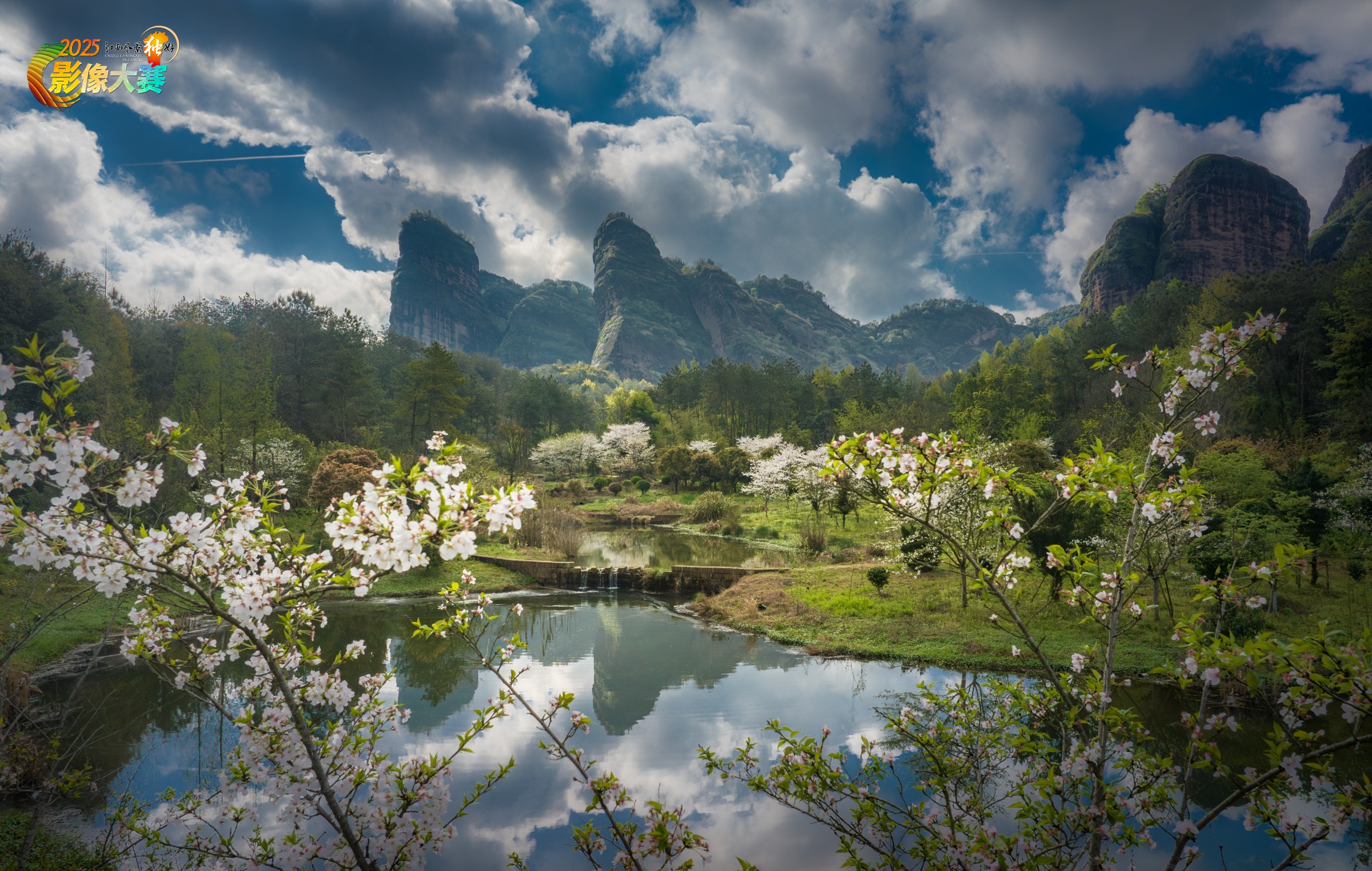 丹霞山峰在蓝天白云下尽显雄浑,山间绿树成荫,近处的湖泊如镜,倒映着天光云影与烂漫的樱花,将丹霞的壮美与春日的柔美巧妙融合。