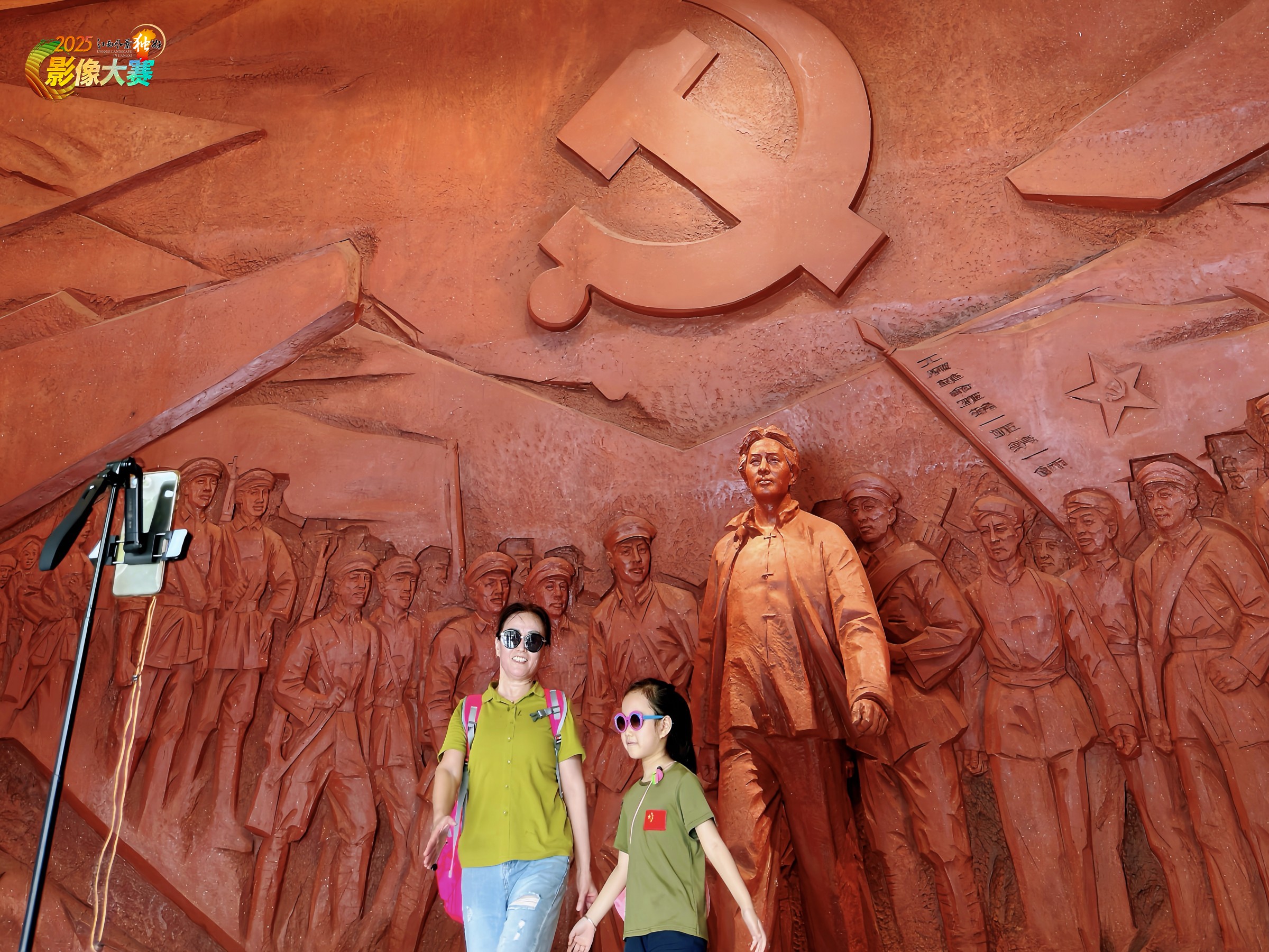 2024年7月6日三湾改编纪念馆里,一对身着军绿色短袖的母女俩,正在兴奋地用手机立在支架上记录红色研学打卡的情景,尤其是小女孩左胸前的国旗魔术贴,引人注目。画面生动活泼、可爱有趣,有较强的红色文化传承的感染力!